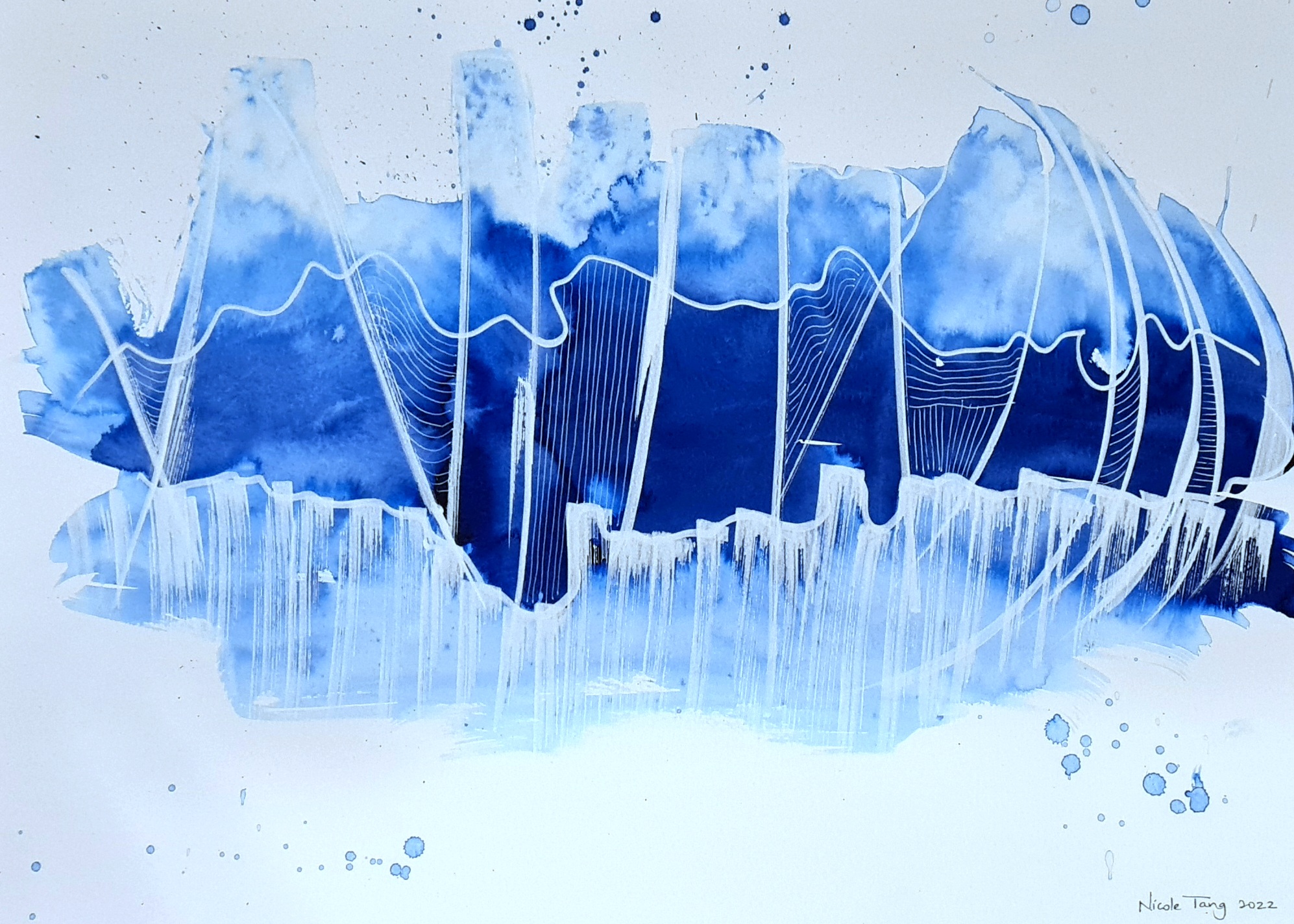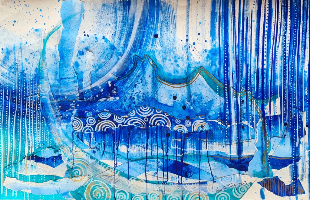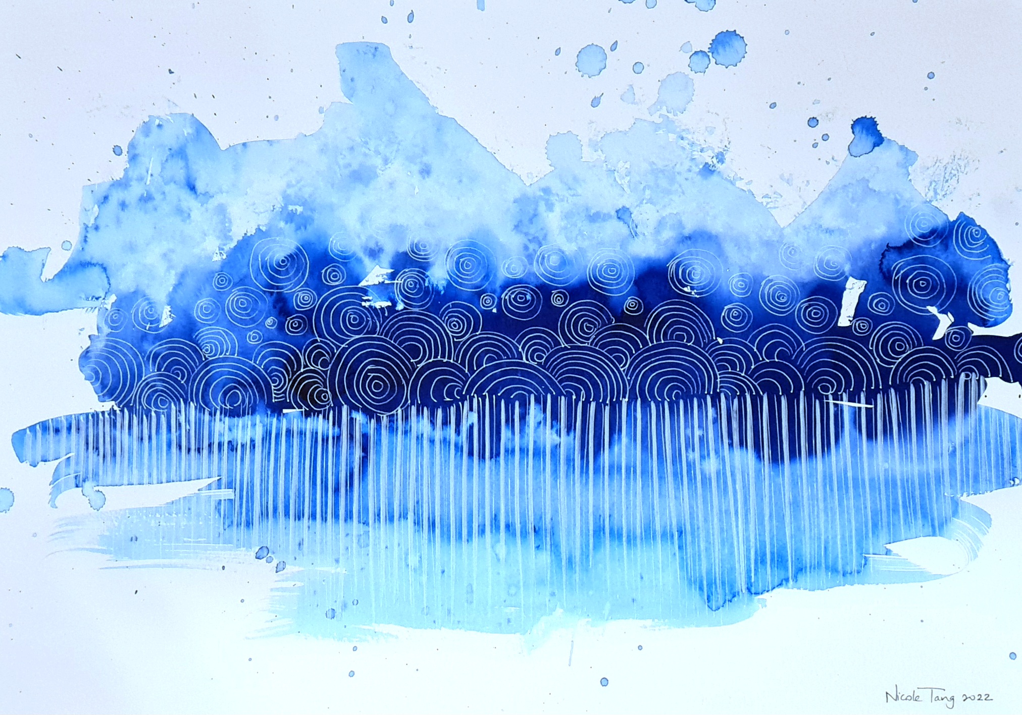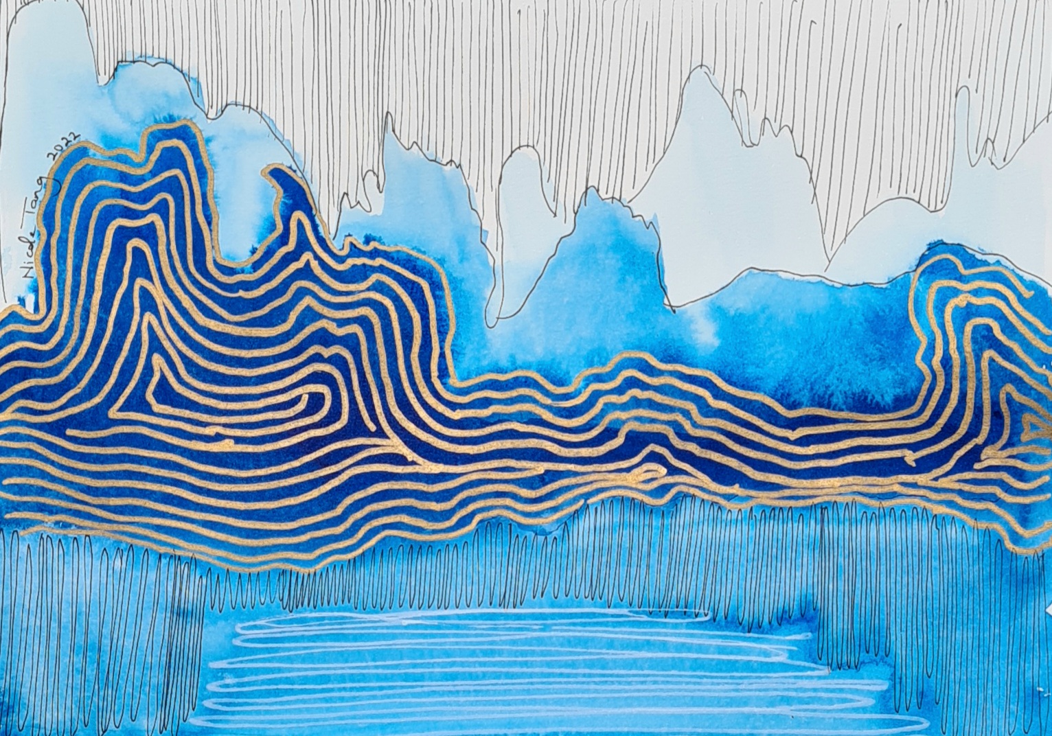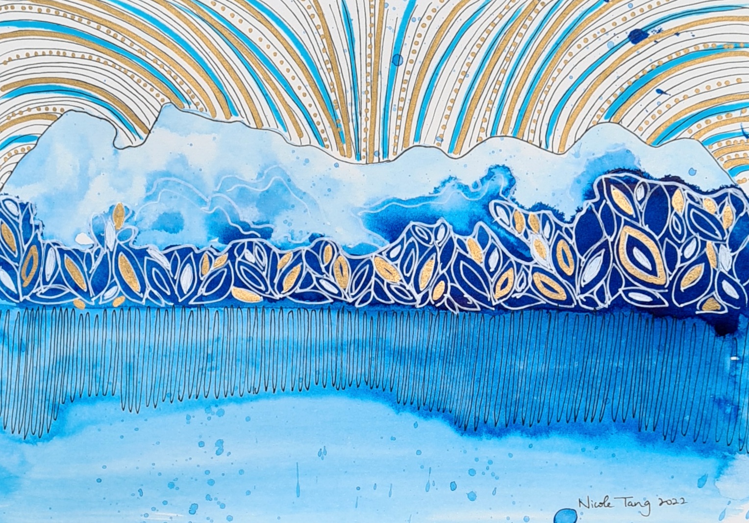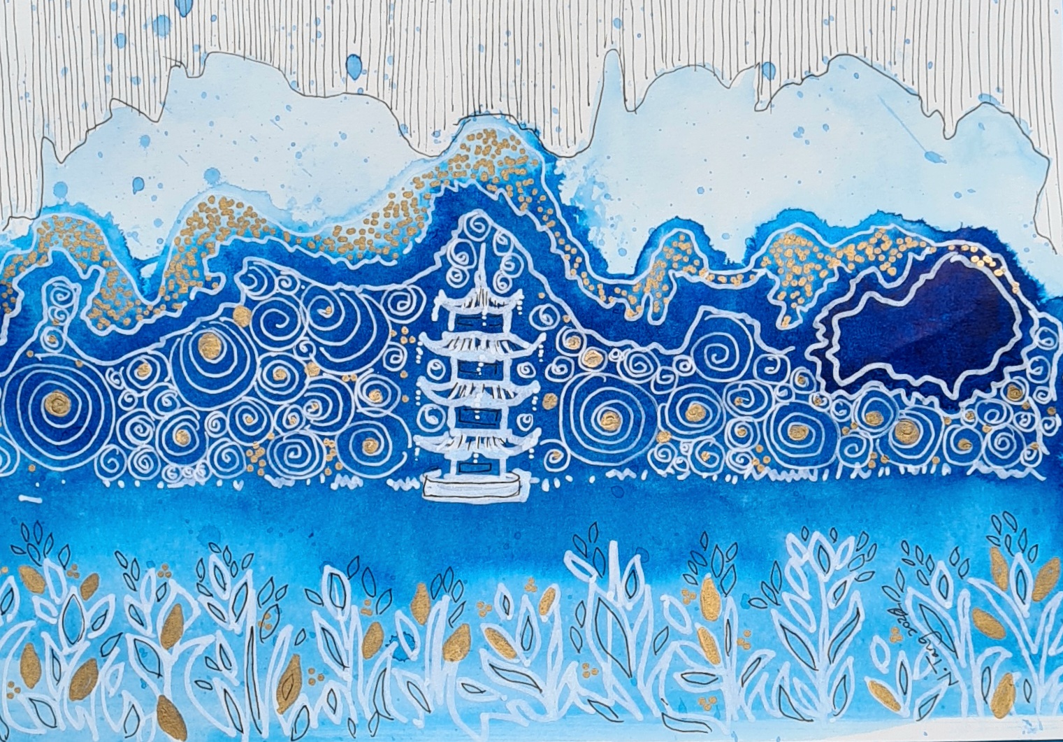 A beautiful collection of over 75 new chinese ink paintings with a new style blossoms in this body of work. Inspired by the artist’s travels to Europe and exploring many art galleries and museums, the artist seeks a more contemporary approach to her paintings with overlays of illustrations on the ink paintings to explore the abstraction in the work. The overlays of white, gold and blue are playful experiments on meditation and liberation which are involved in the process of creation. While meditation involves focus, liberation involves letting go and focuses on the spontaneous.