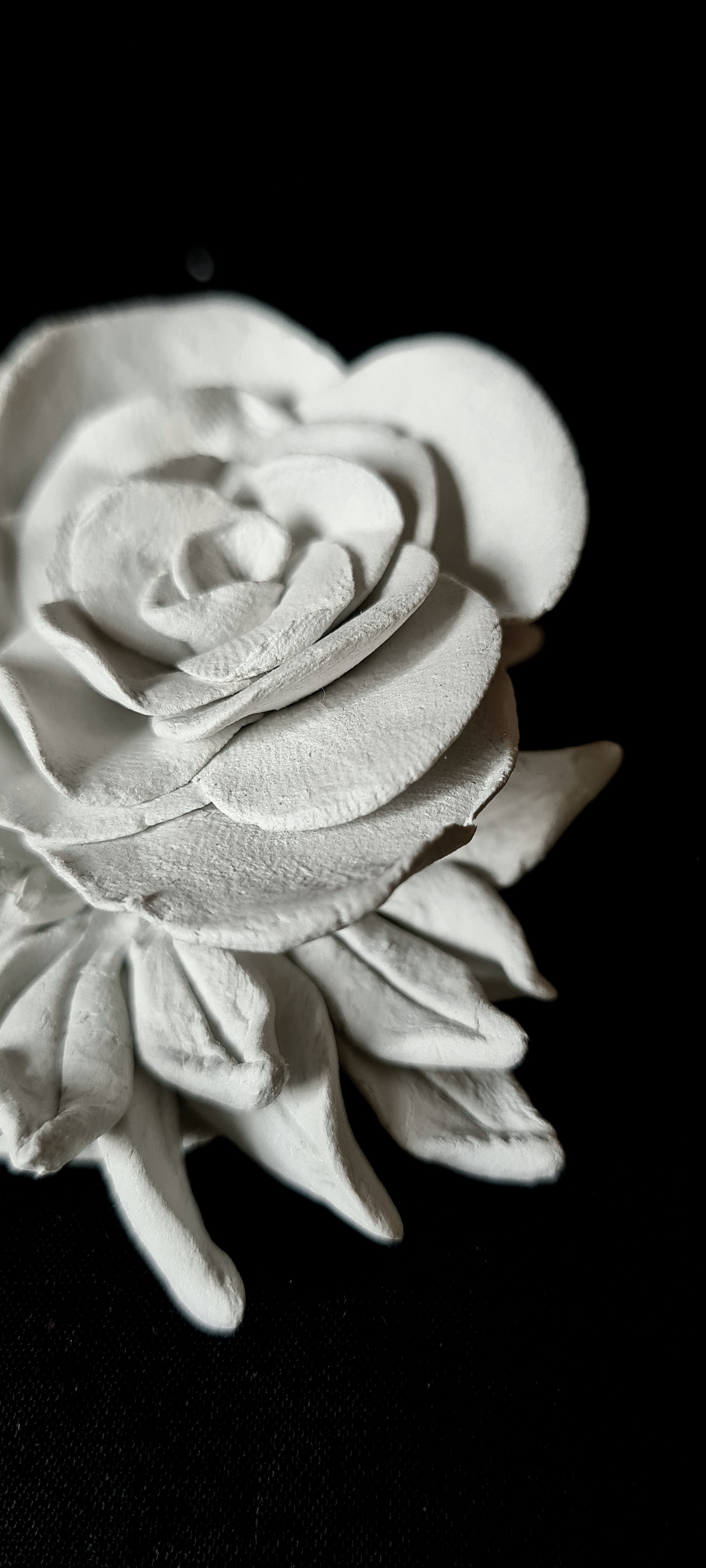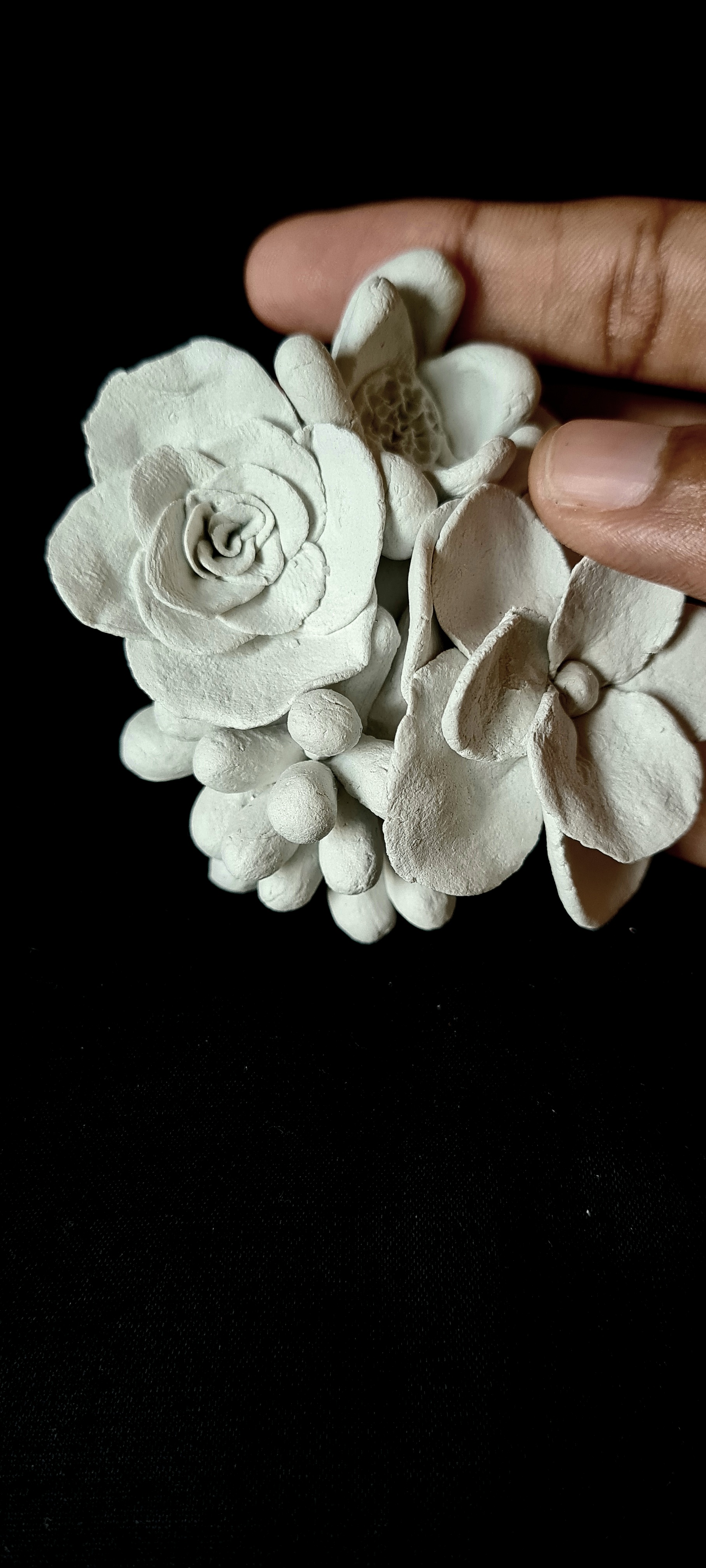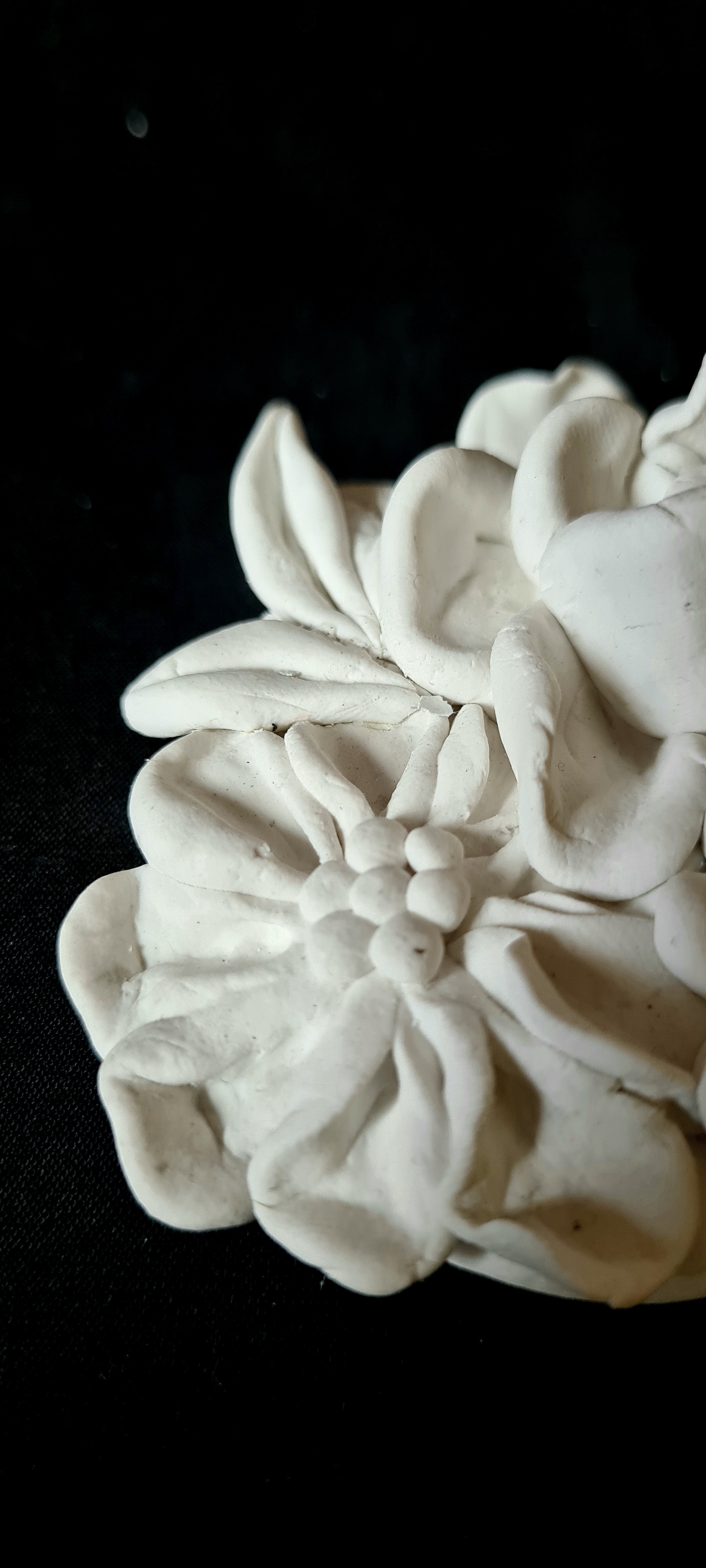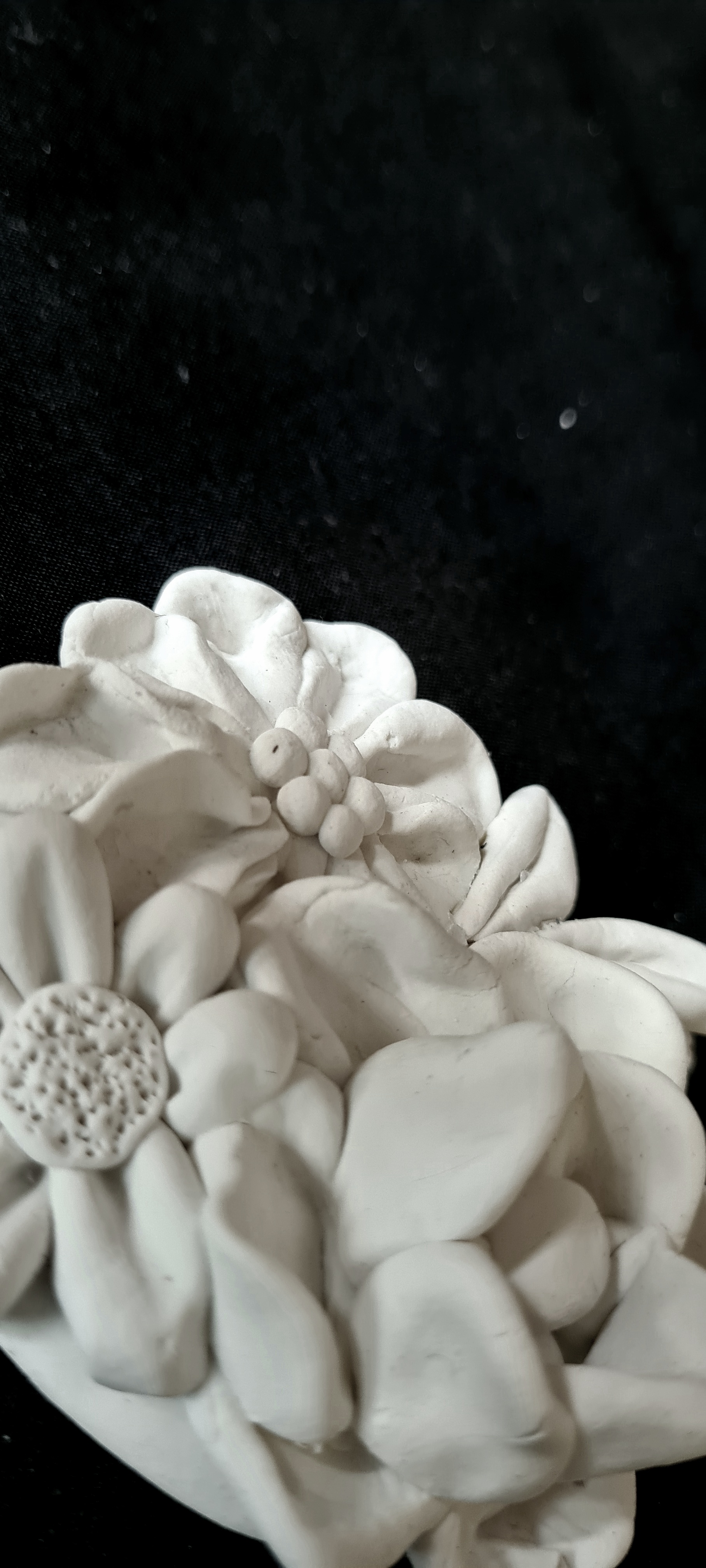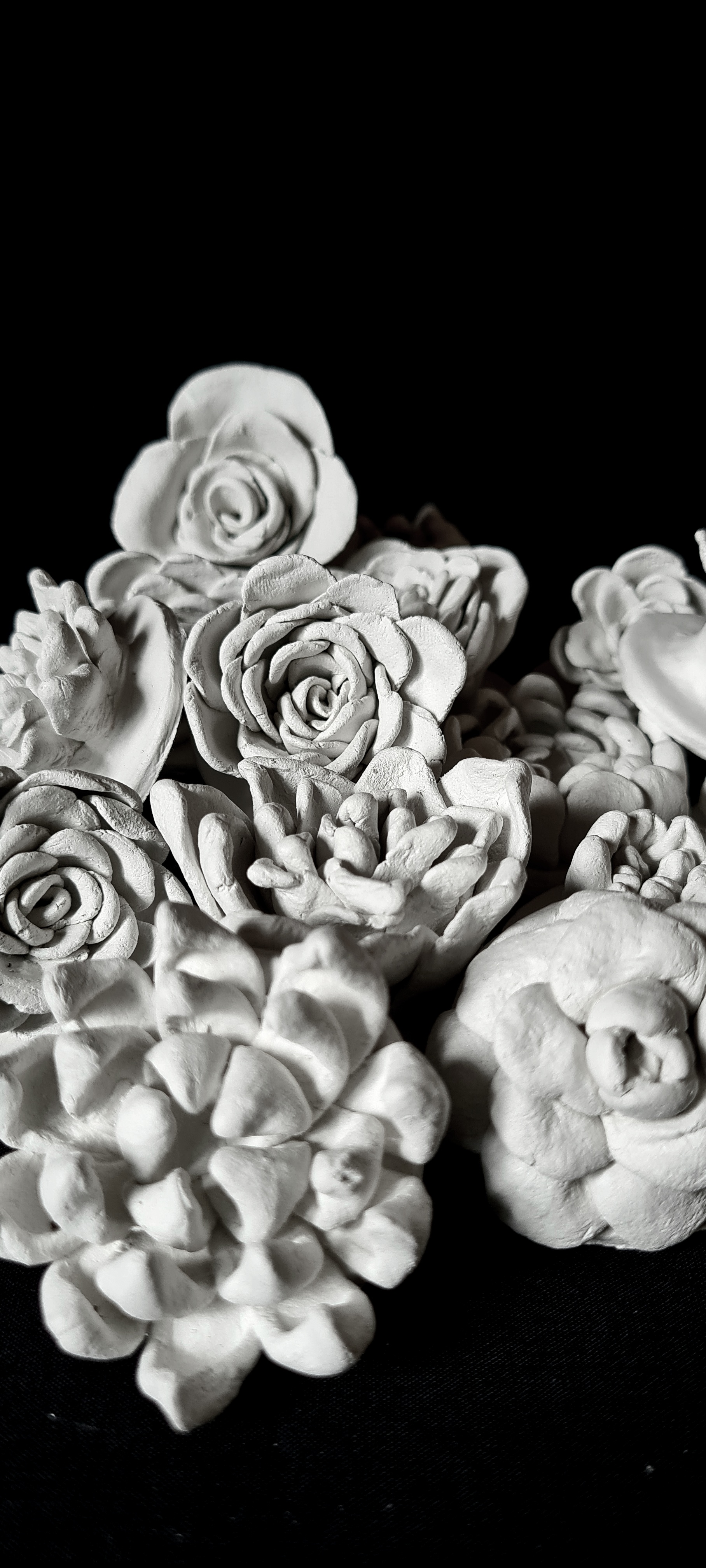 The artist has always been inspired by classical white marble sculptures from the Greek and Romans. This monchromatic collection of sculptured white flowers from clay gets its inspiration from that fascination. The artist does not have a lot of experience with sculpture so this collection was a fun and experimental expression of her love for nature and themes relating to growth, life and death.