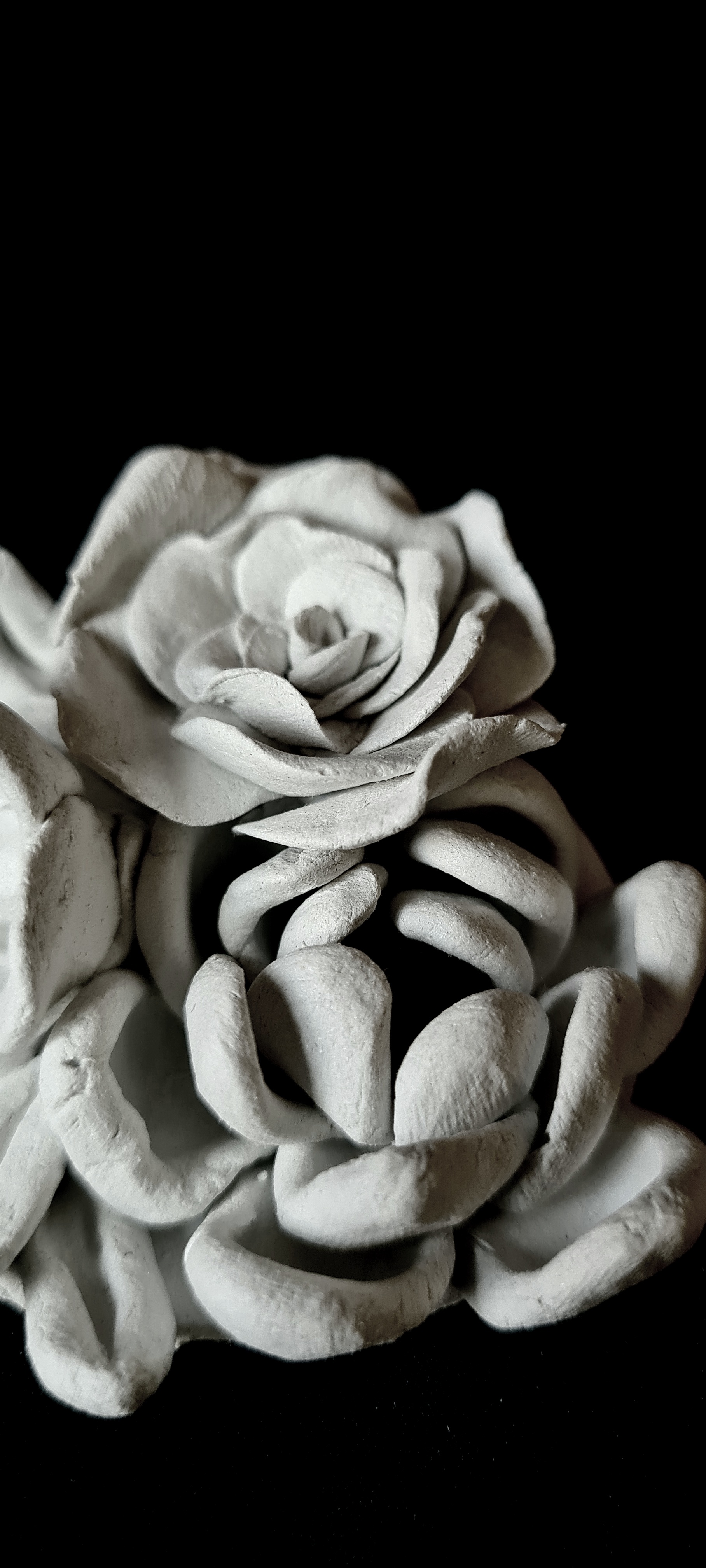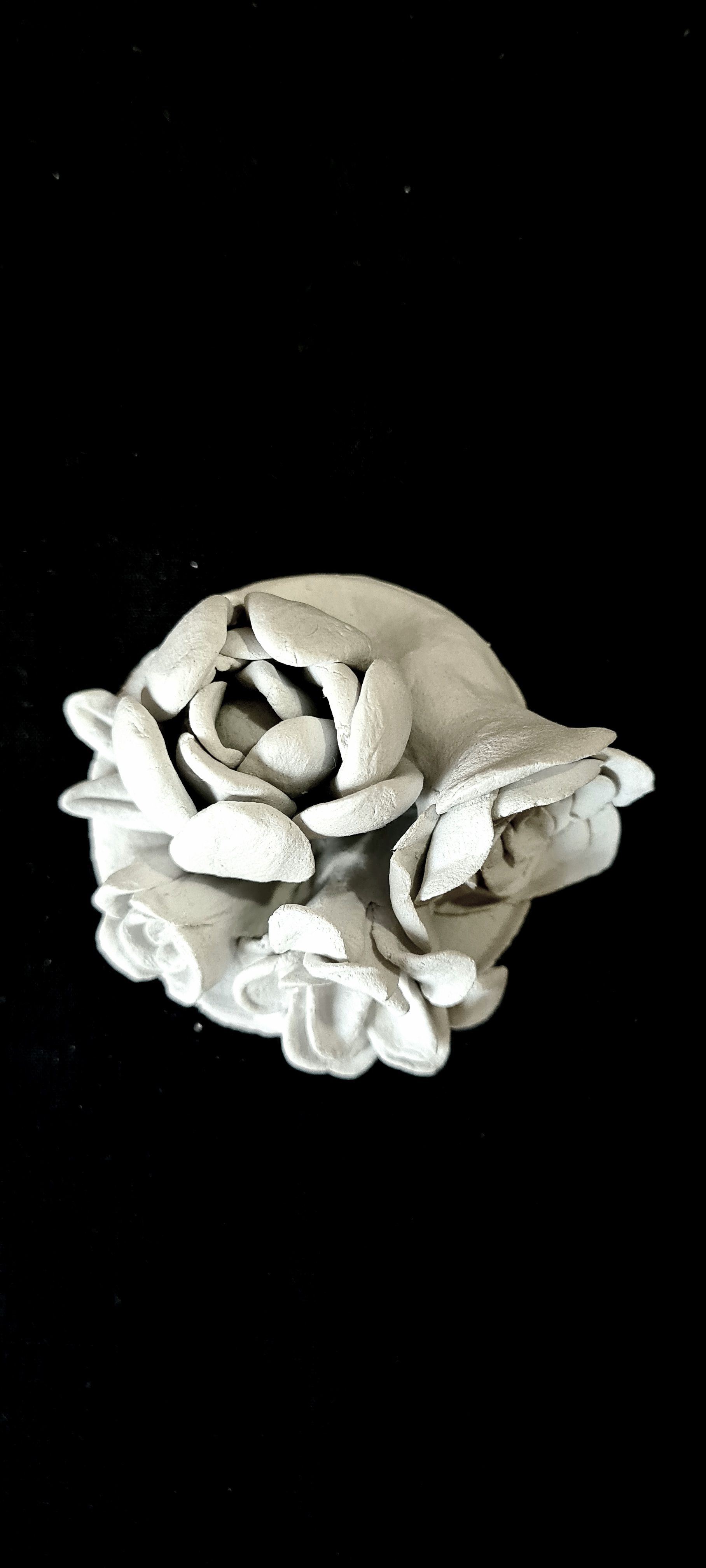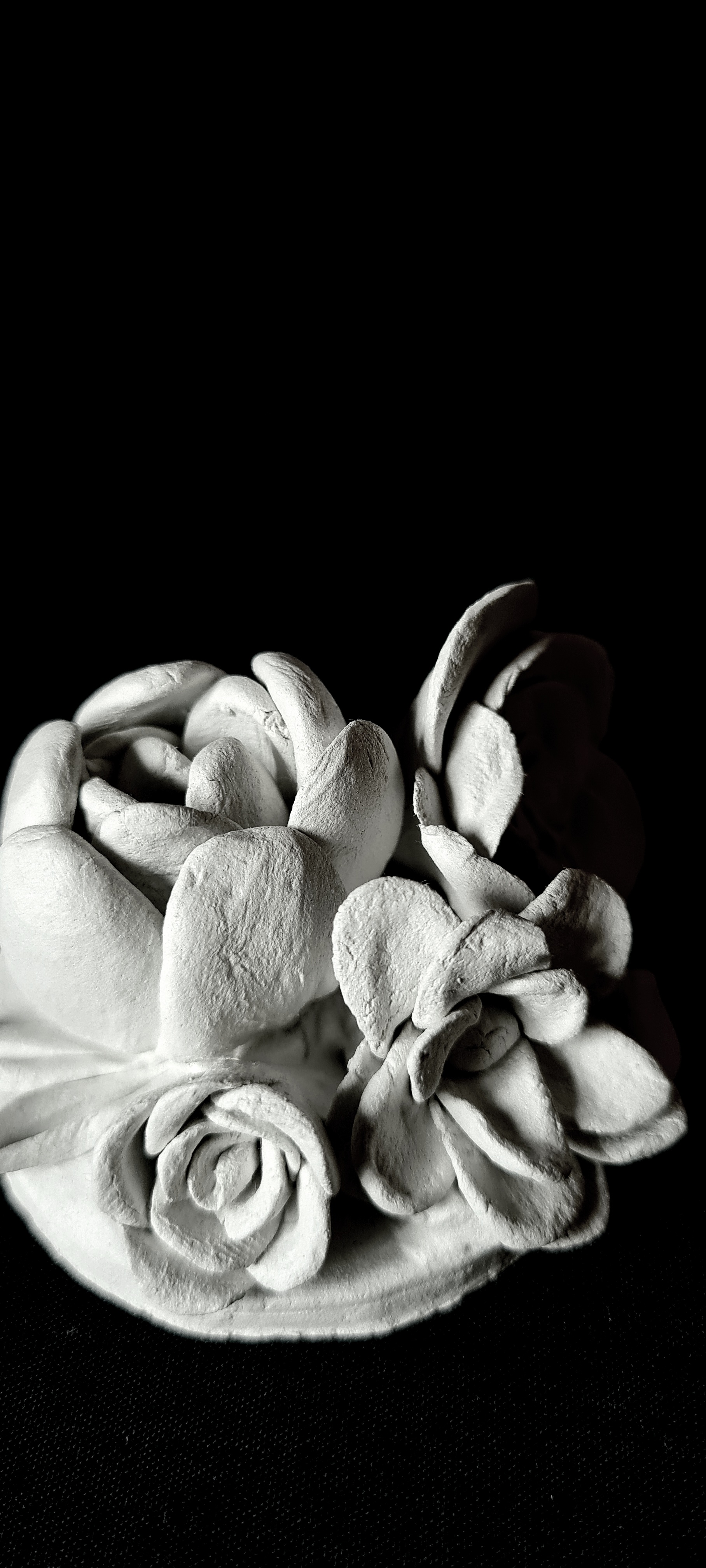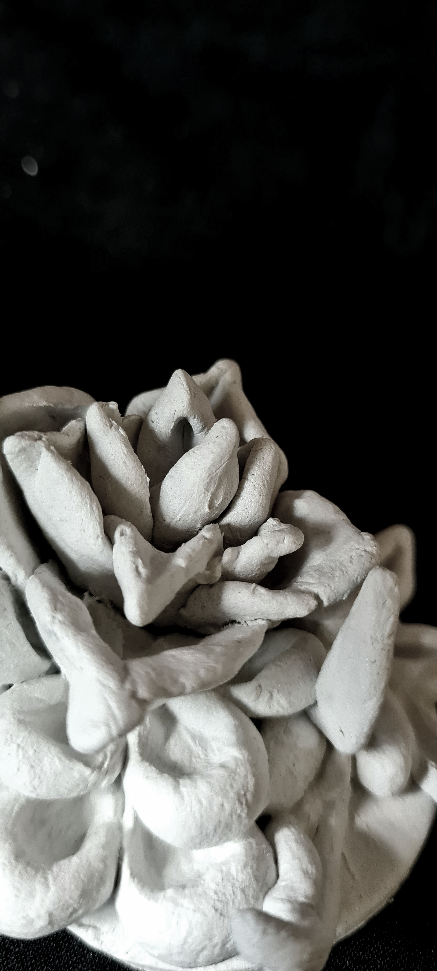 The artist has always been inspired by classical white marble sculptures from the Greek and Romans. This monchromatic collection of sculptured white flowers from clay gets its inspiration from that fascination. The artist does not have a lot of experience with sculpture so this collection was a fun and experimental expression of her love for nature and themes relating to growth, life and death.