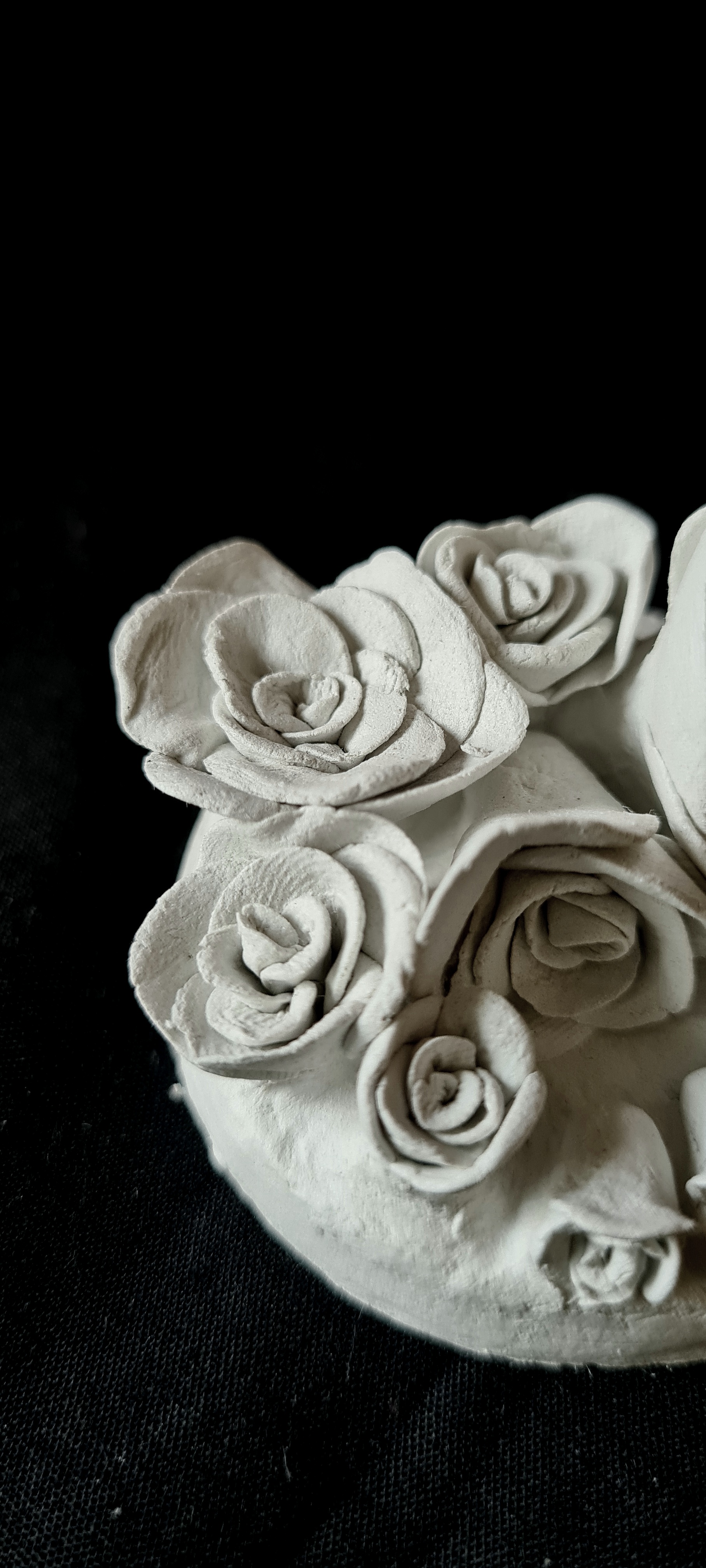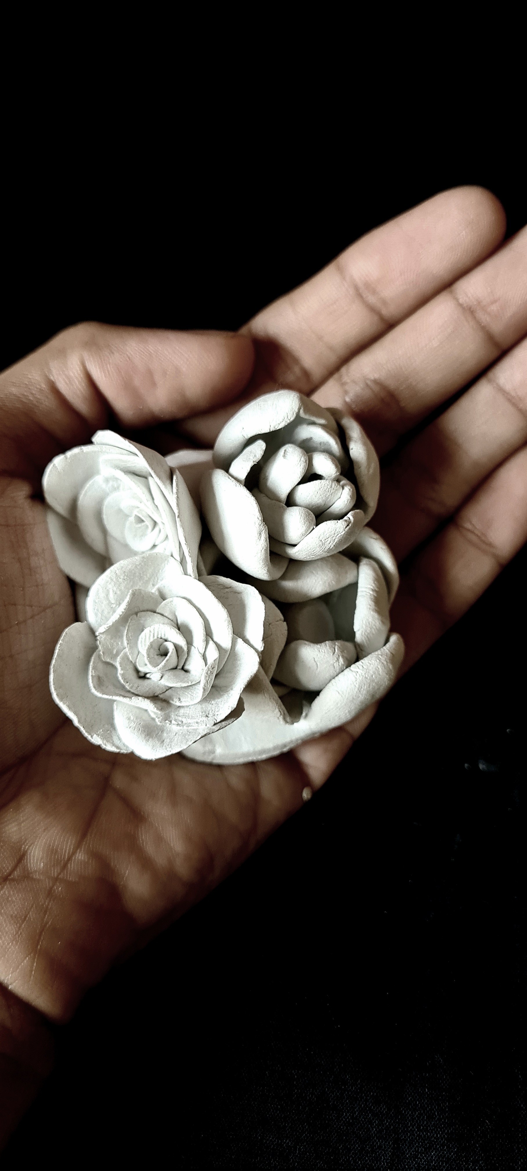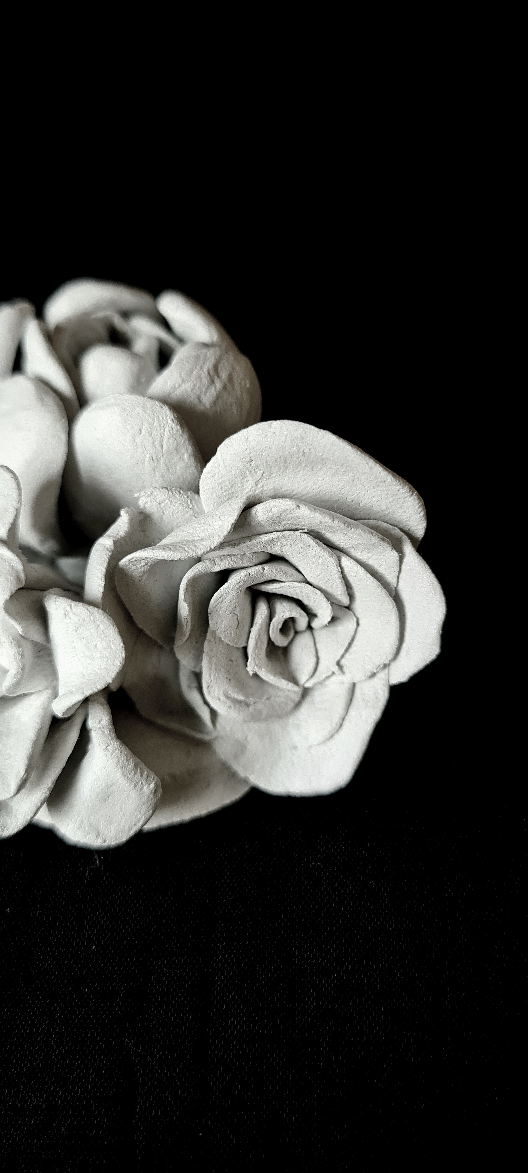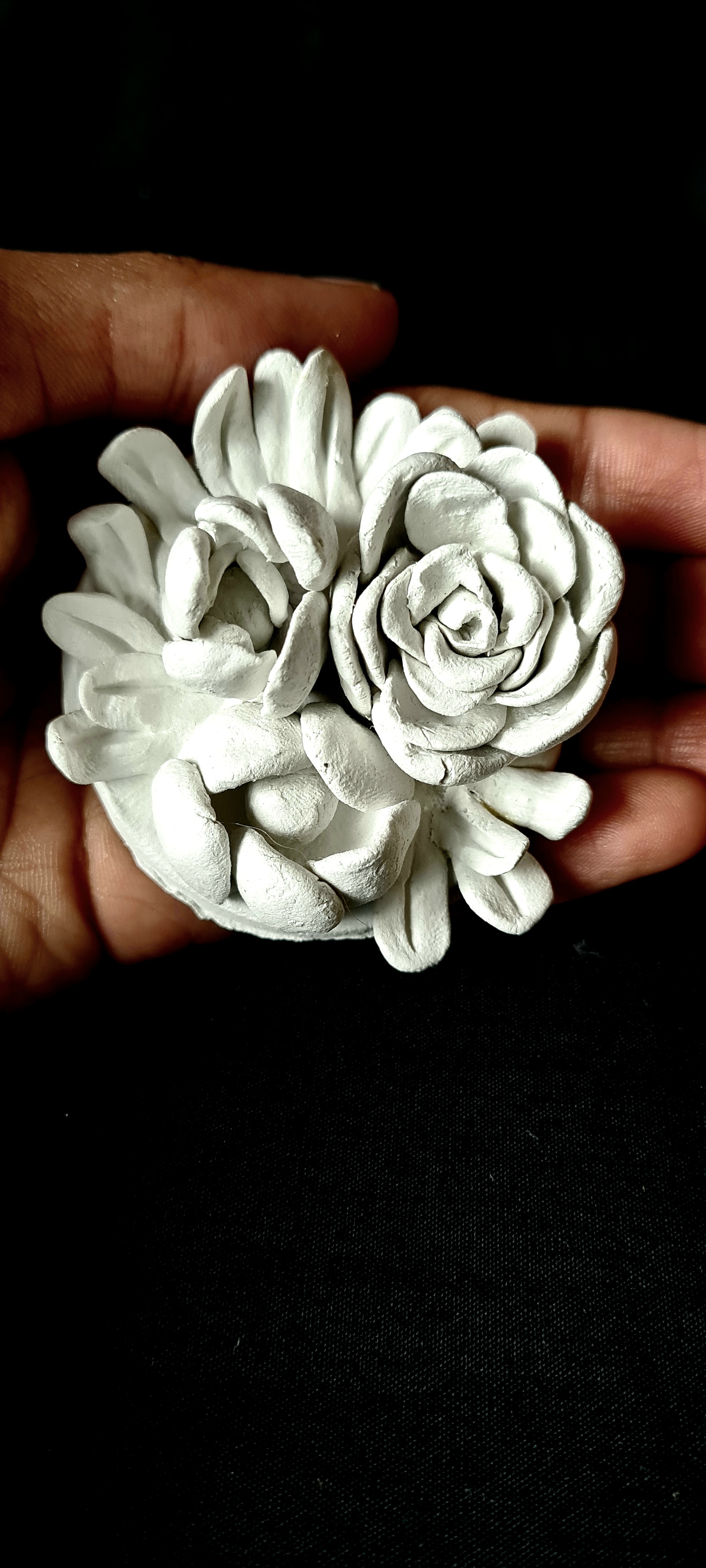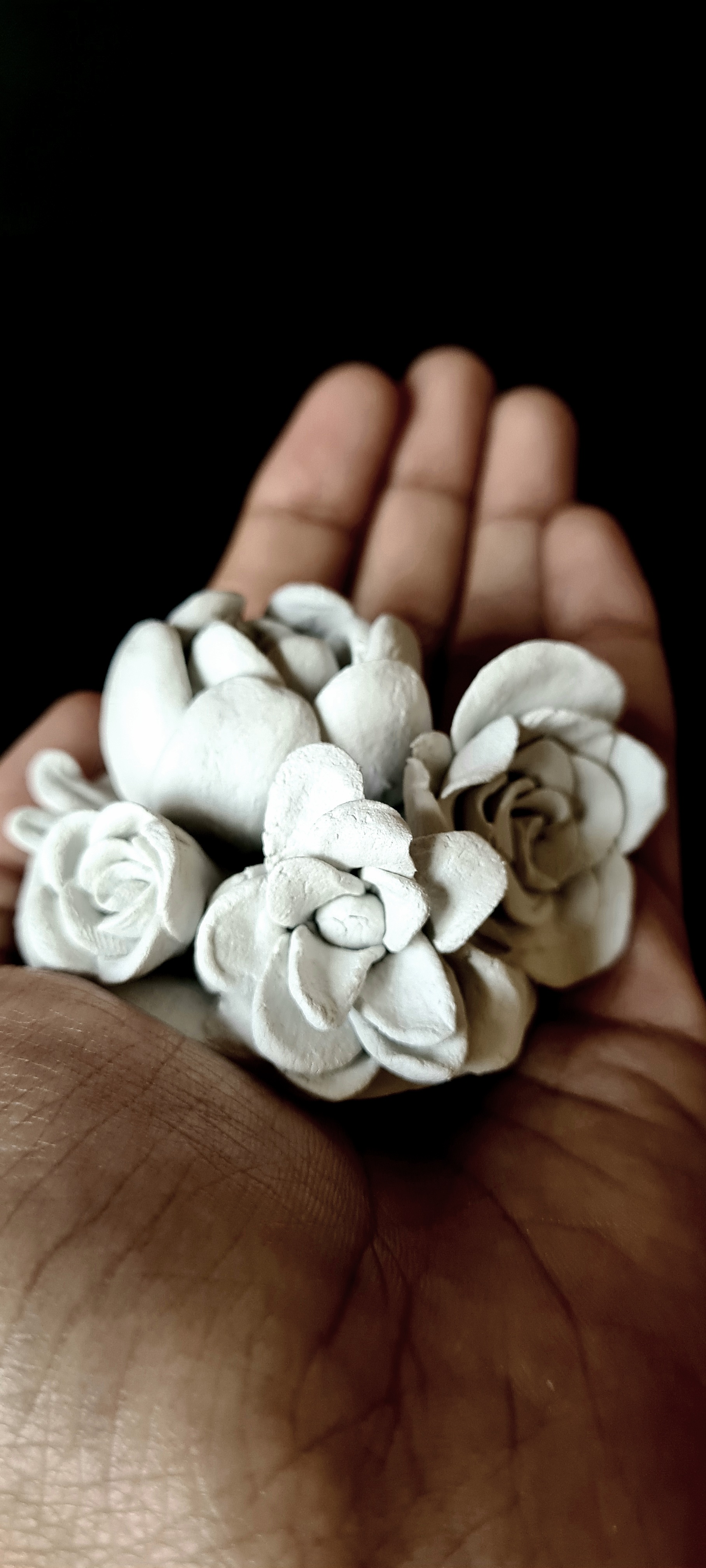 The artist has always been inspired by classical white marble sculptures from the Greek and Romans. This monchromatic collection of sculptured white flowers from clay gets its inspiration from that fascination. The artist does not have a lot of experience with sculpture so this collection was a fun and experimental expression of her love for nature and themes relating to growth, life and death.