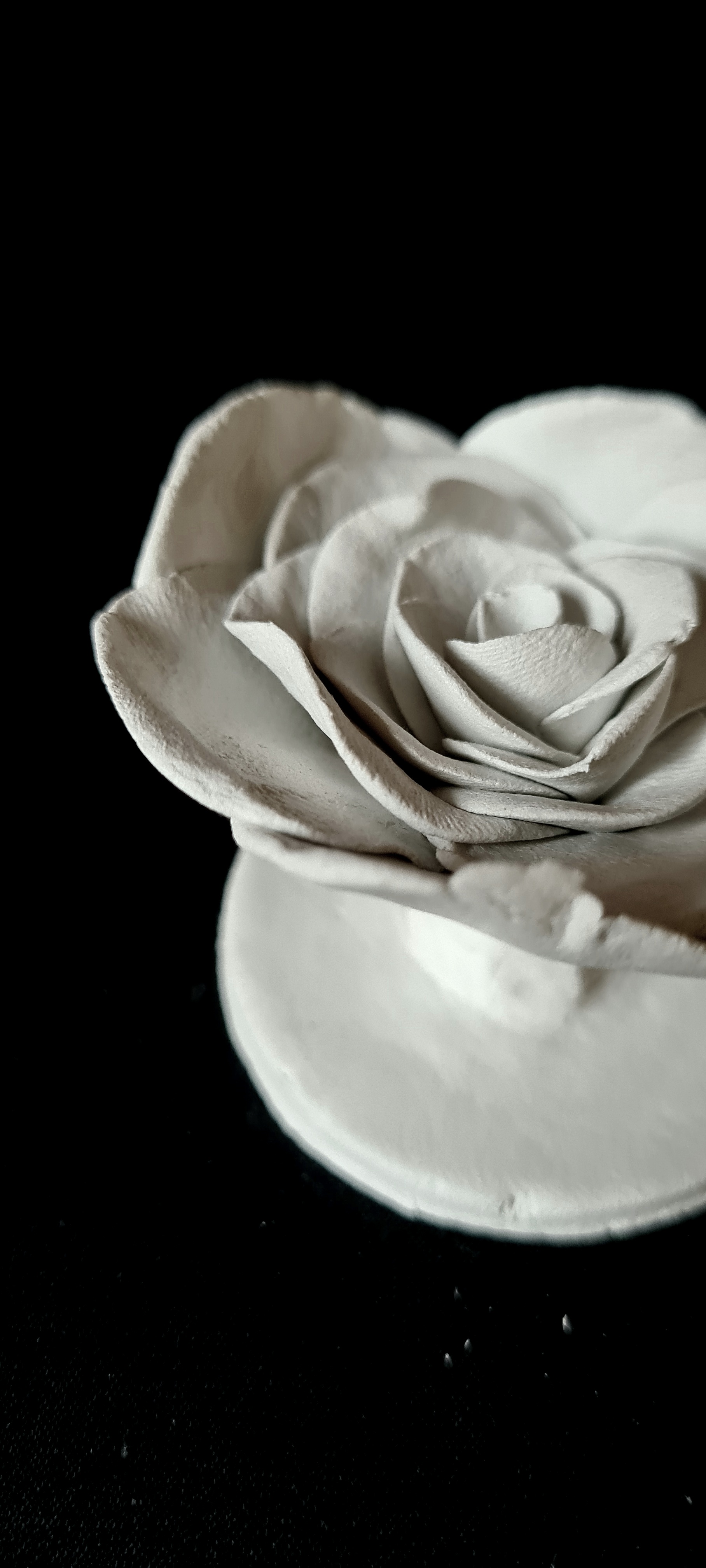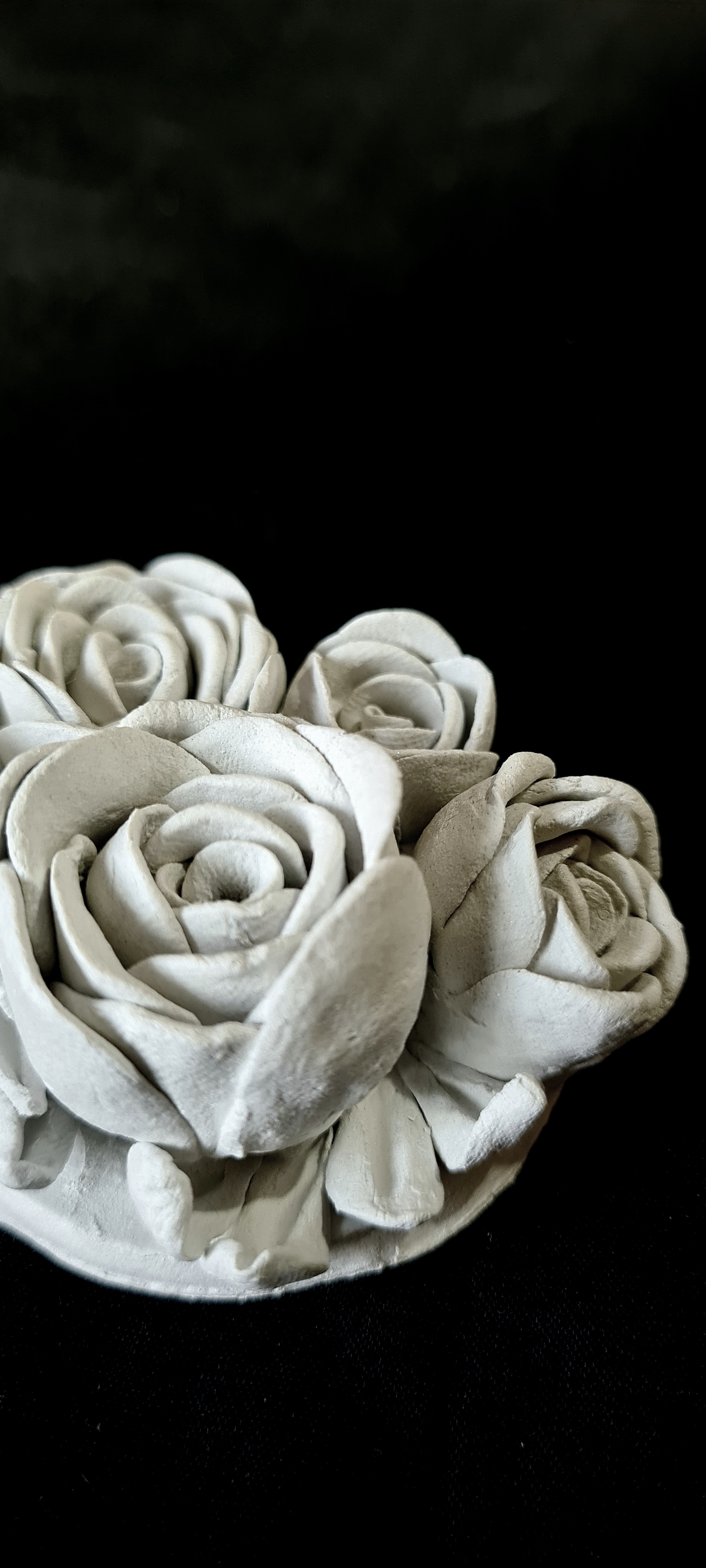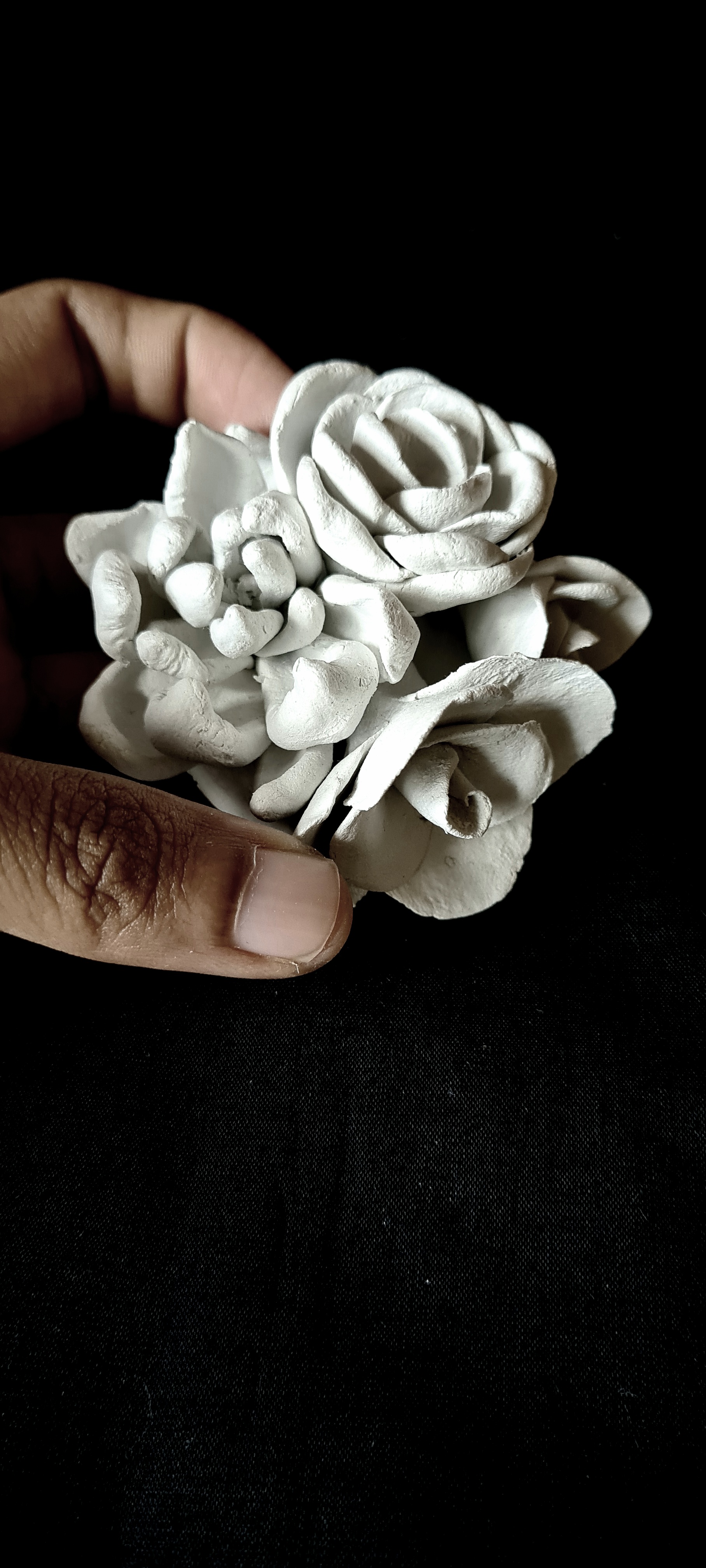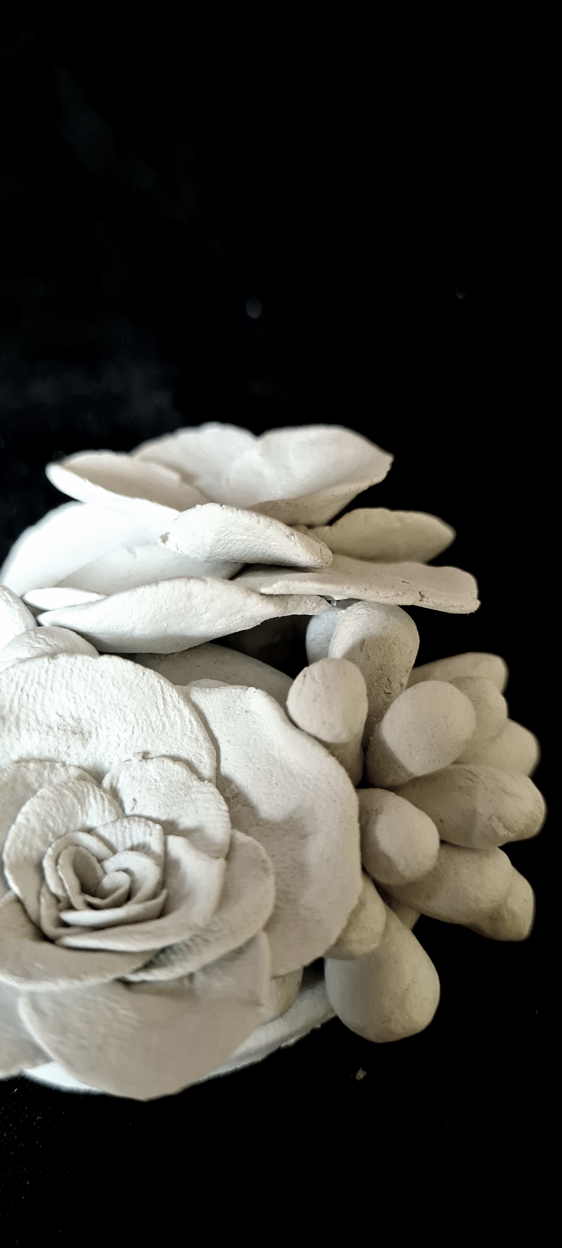 The artist has always been inspired by classical white marble sculptures from the Greek and Romans. This monchromatic collection of sculptured white flowers from clay gets its inspiration from that fascination. The artist does not have a lot of experience with sculpture so this collection was a fun and experimental expression of her love for nature and themes relating to growth, life and death.