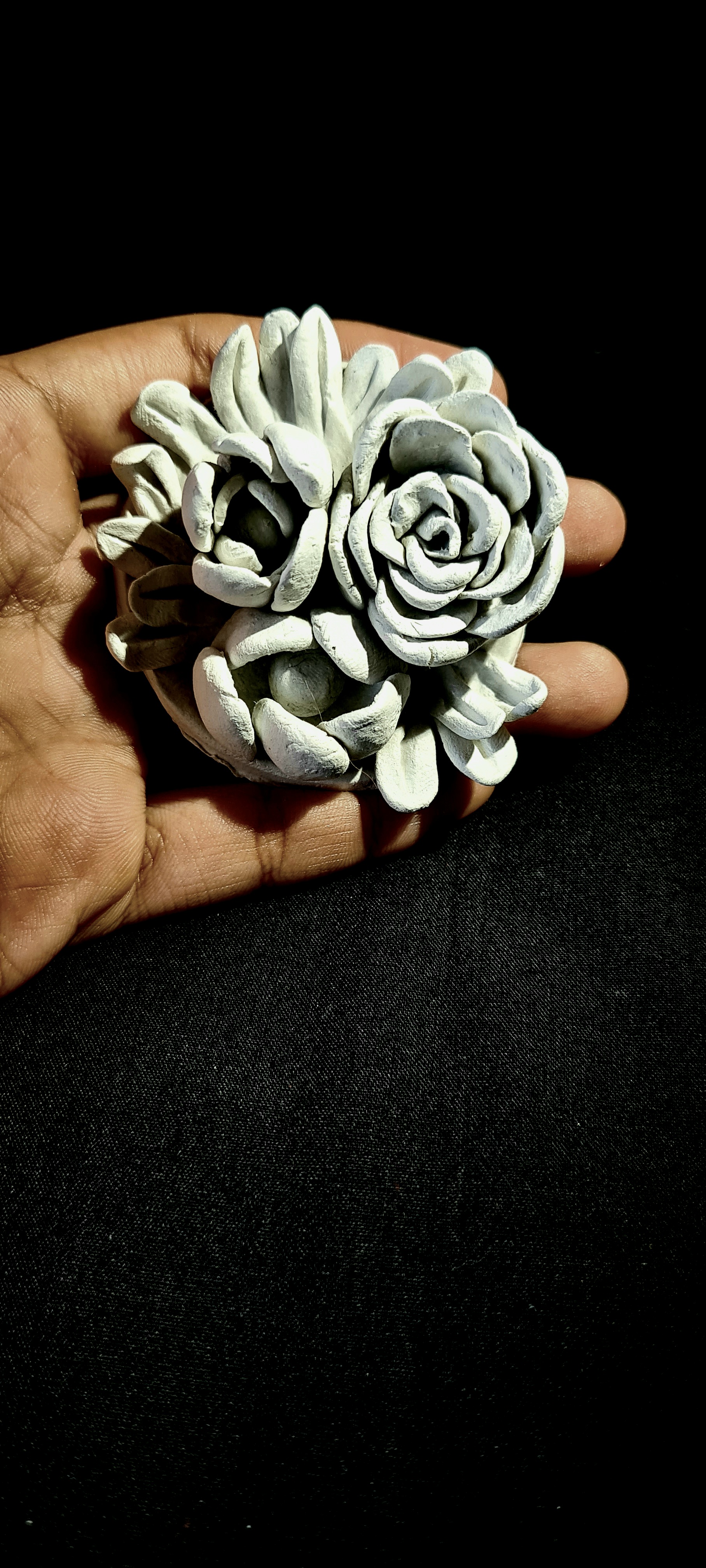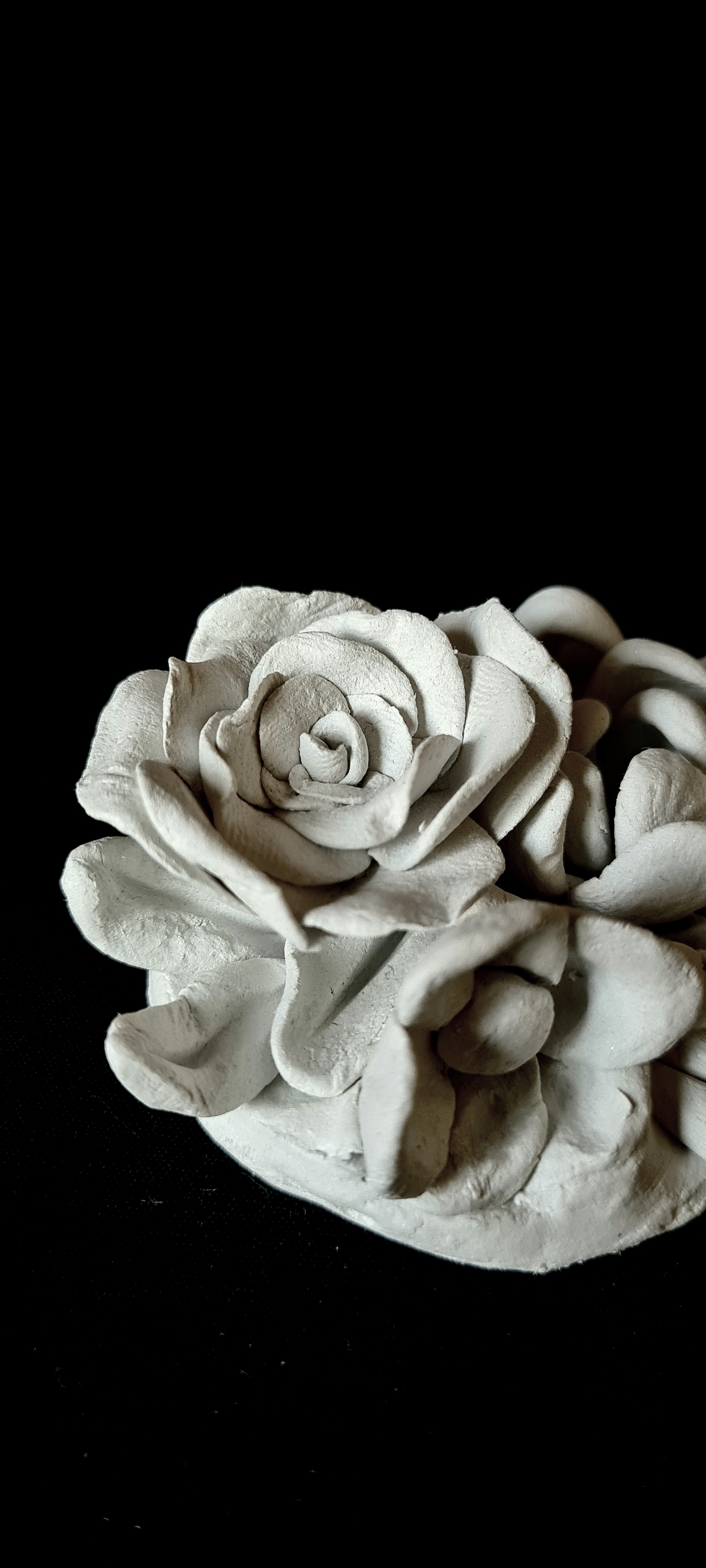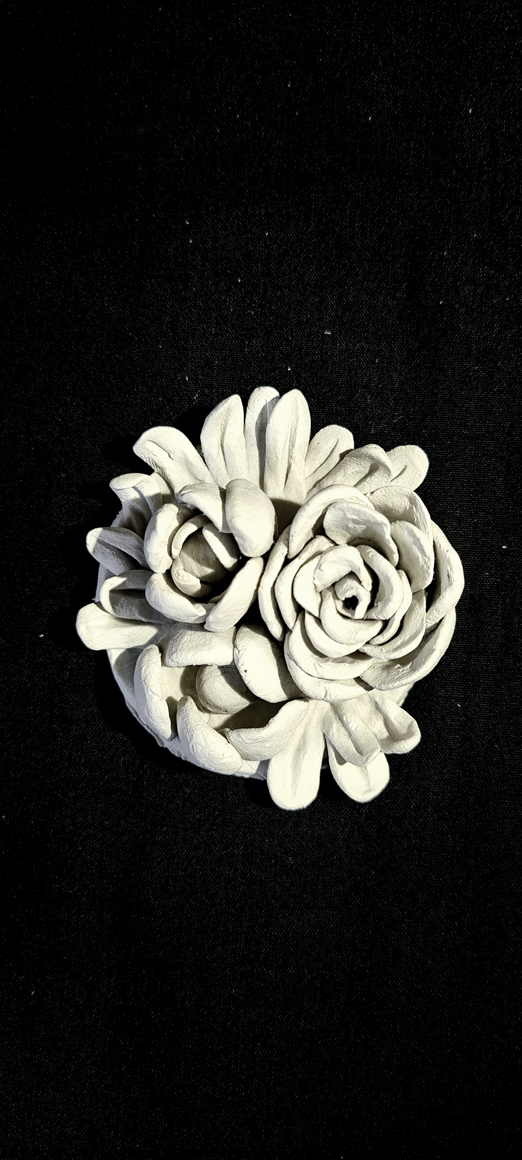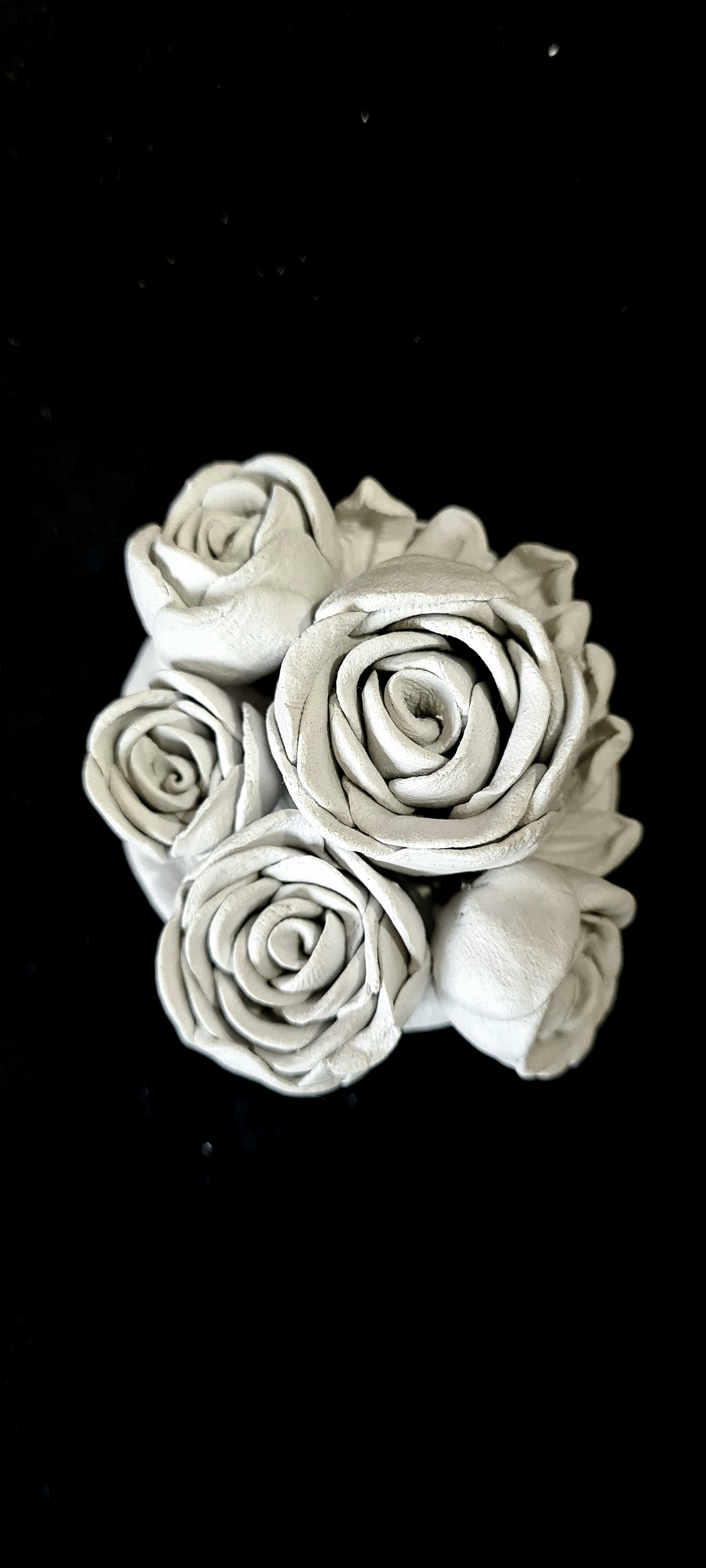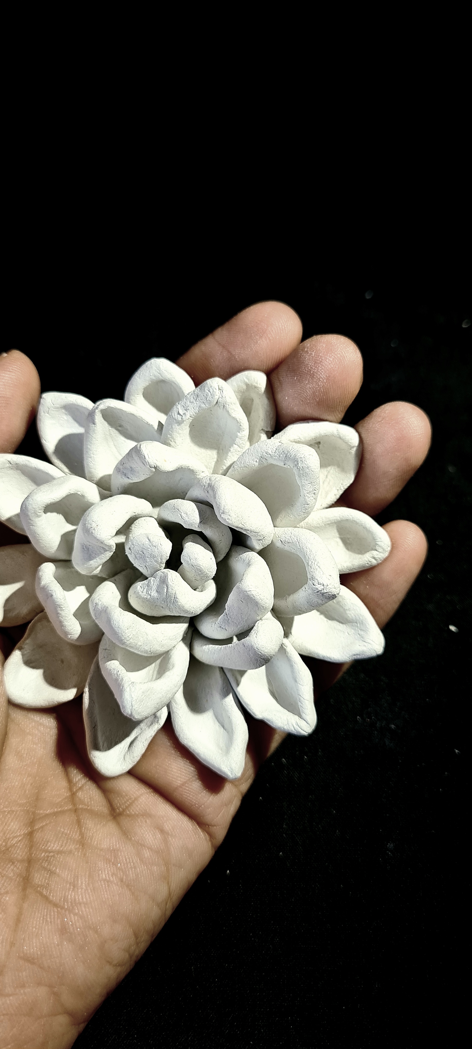 The artist has always been inspired by classical white marble sculptures from the Greek and Romans. This monchromatic collection of sculptured white flowers from clay gets its inspiration from that fascination. The artist does not have a lot of experience with sculpture so this collection was a fun and experimental expression of her love for nature and themes relating to growth, life and death.