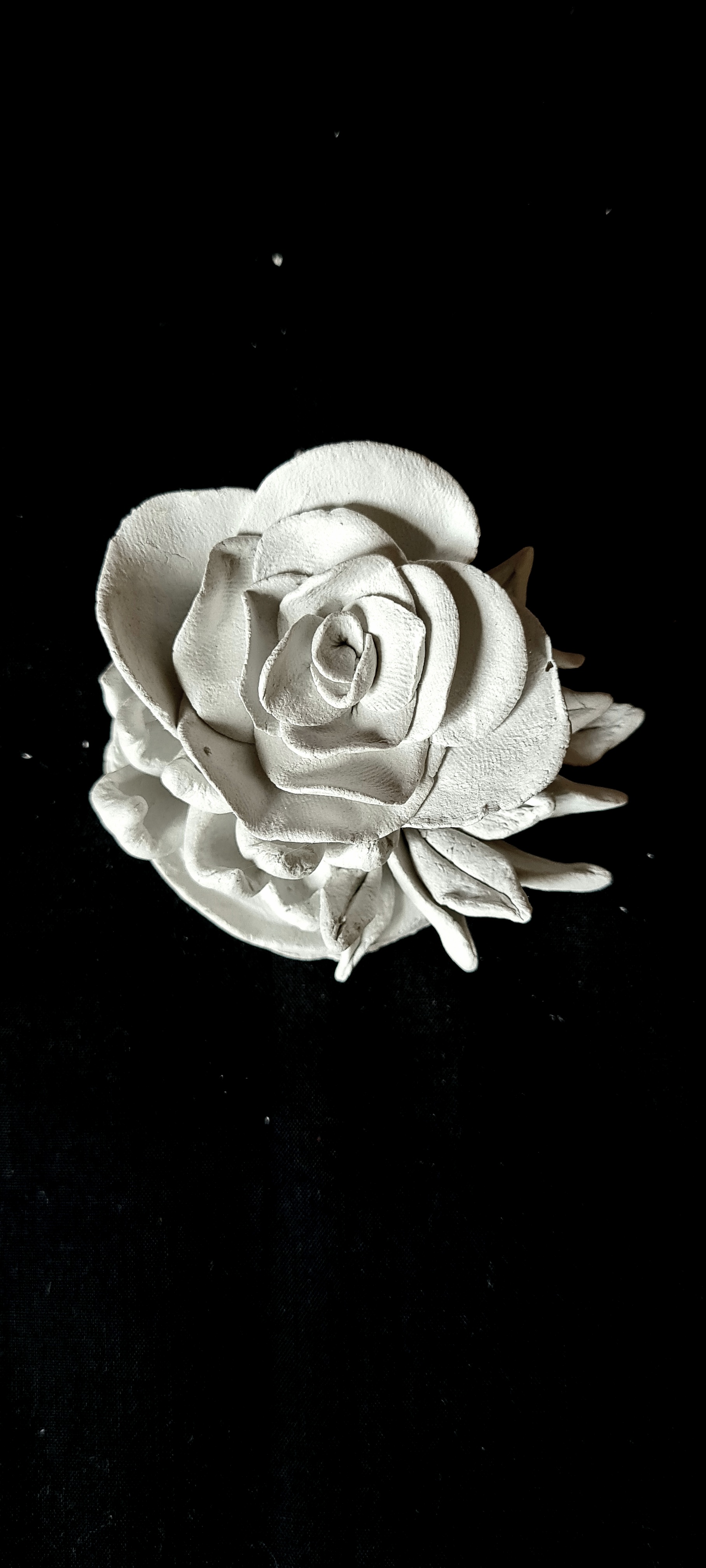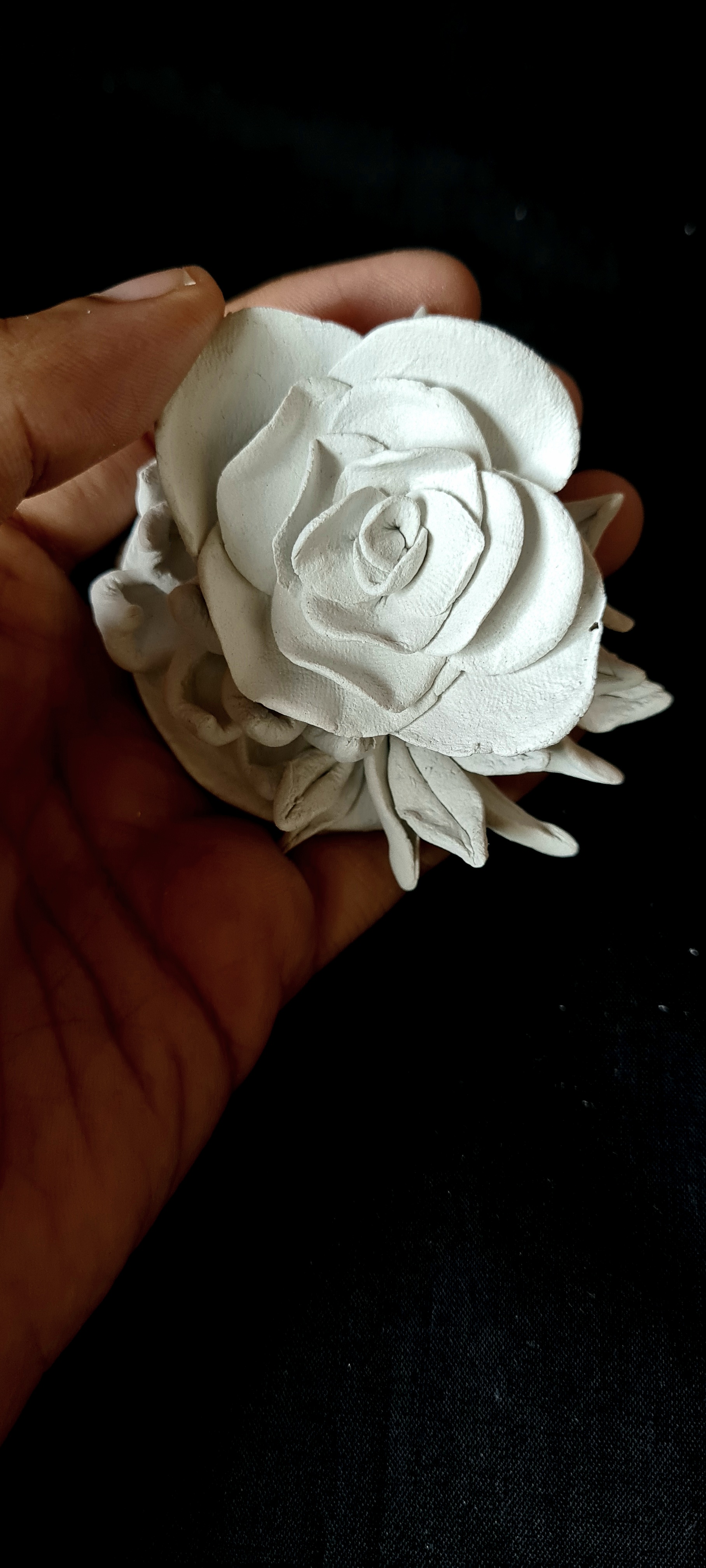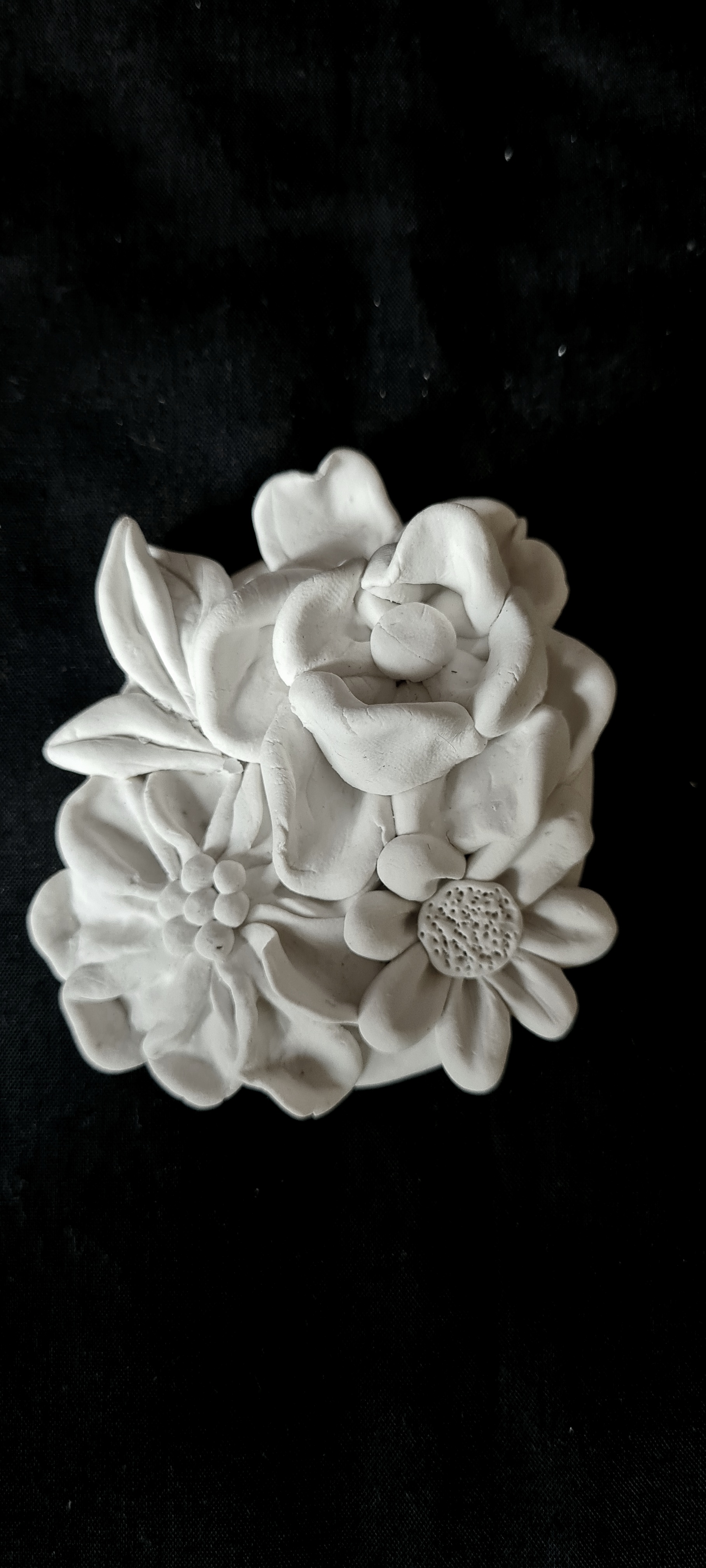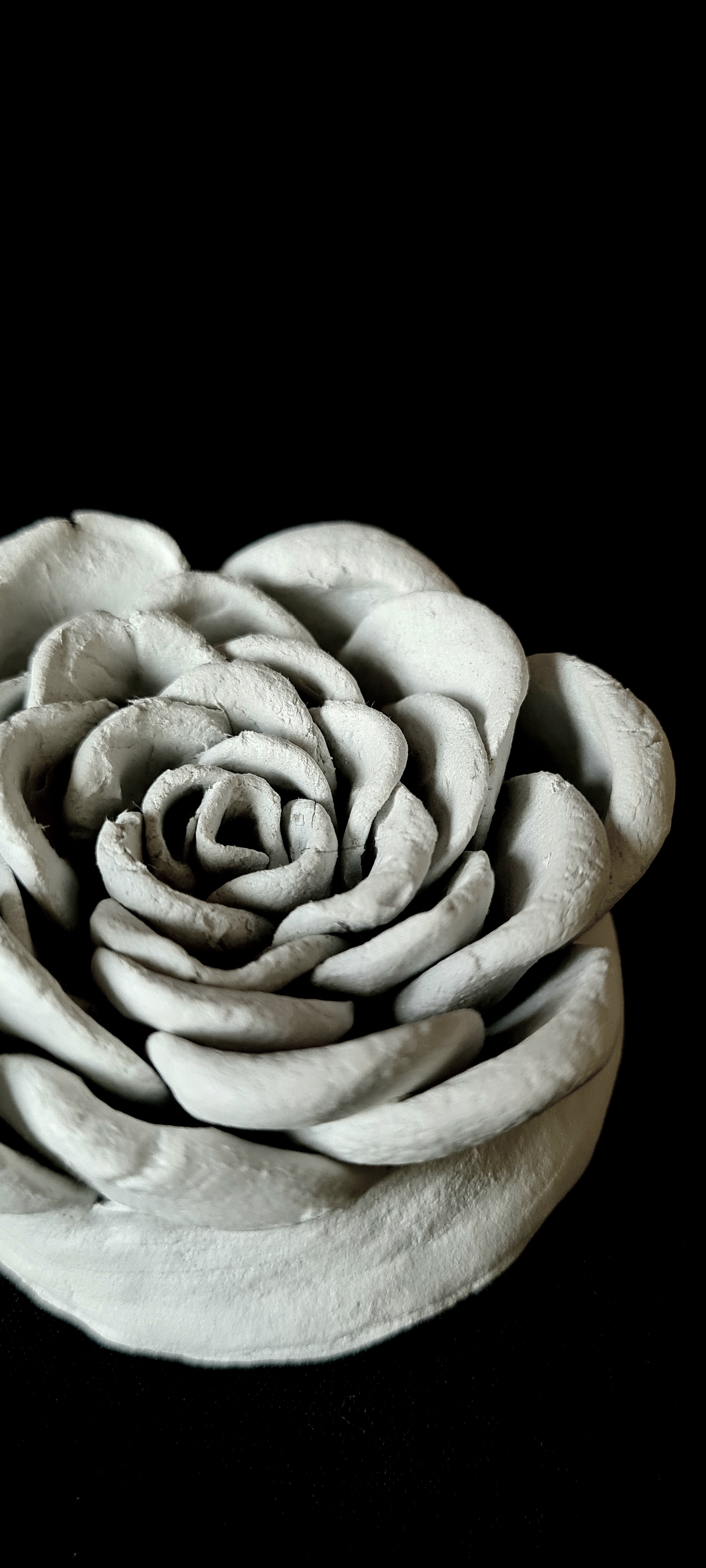 The artist has always been inspired by classical white marble sculptures from the Greek and Romans. This monchromatic collection of sculptured white flowers from clay gets its inspiration from that fascination. The artist does not have a lot of experience with sculpture so this collection was a fun and experimental expression of her love for nature and themes relating to growth, life and death.