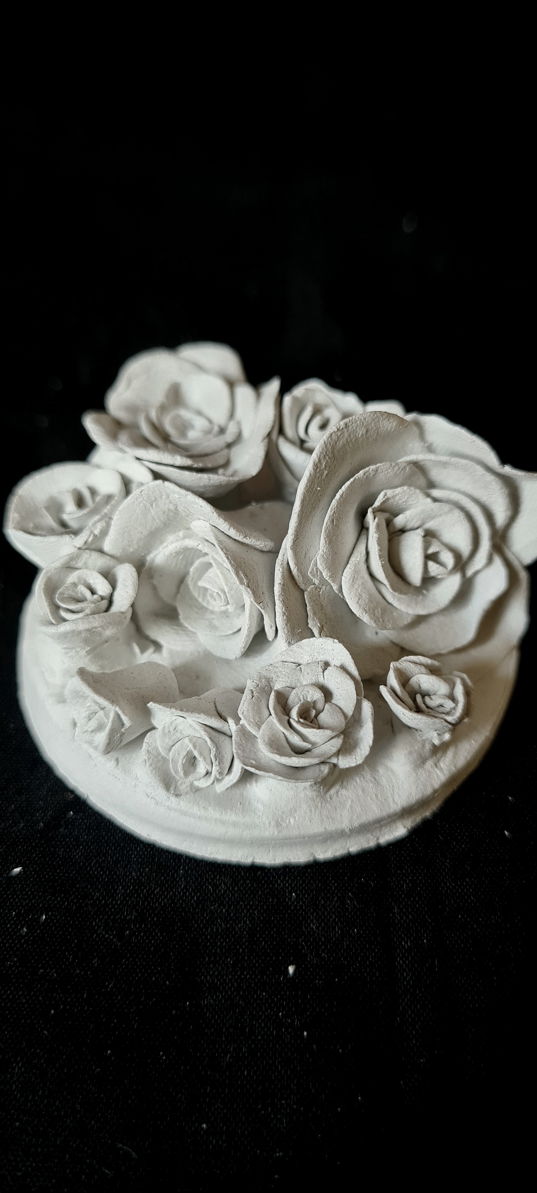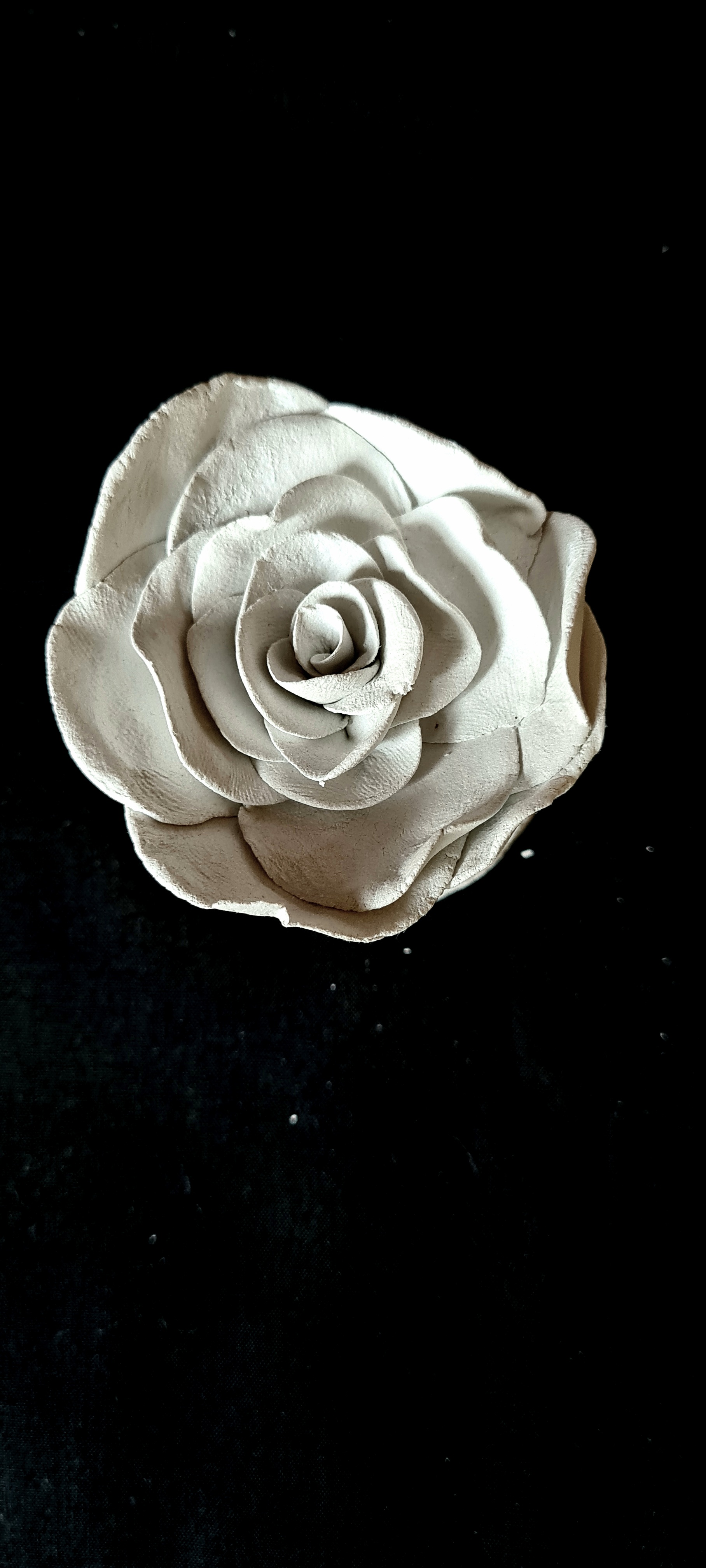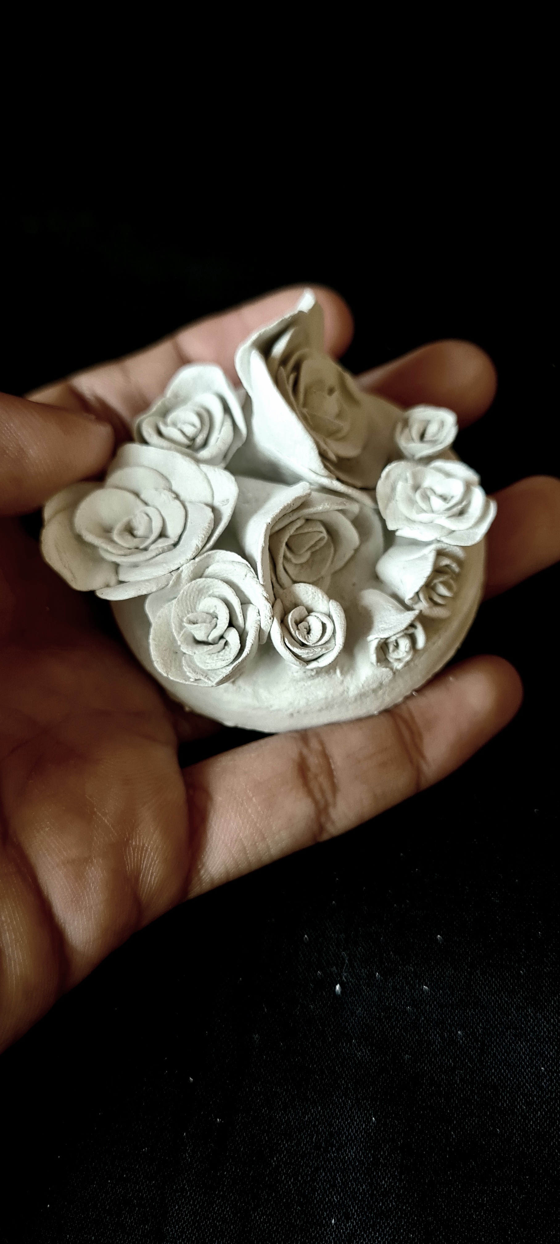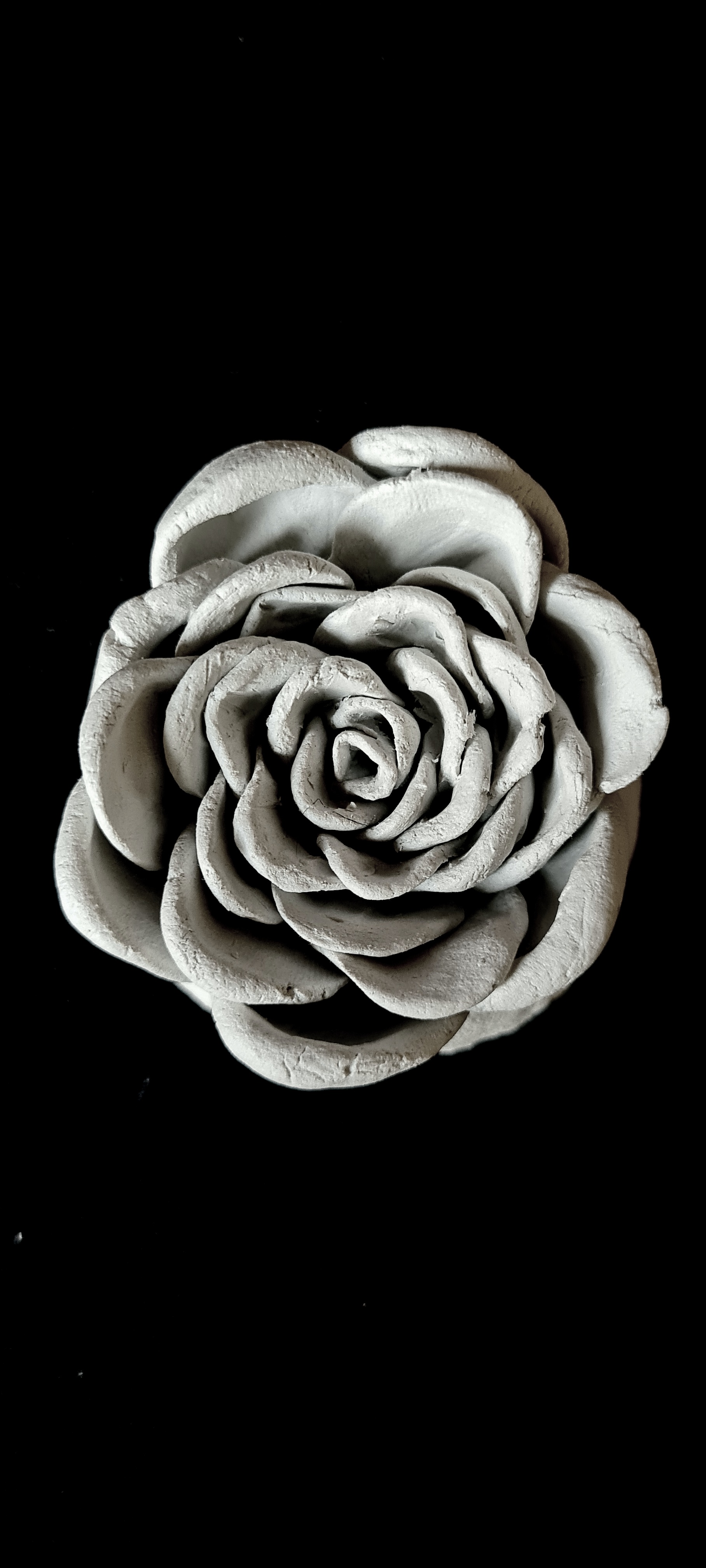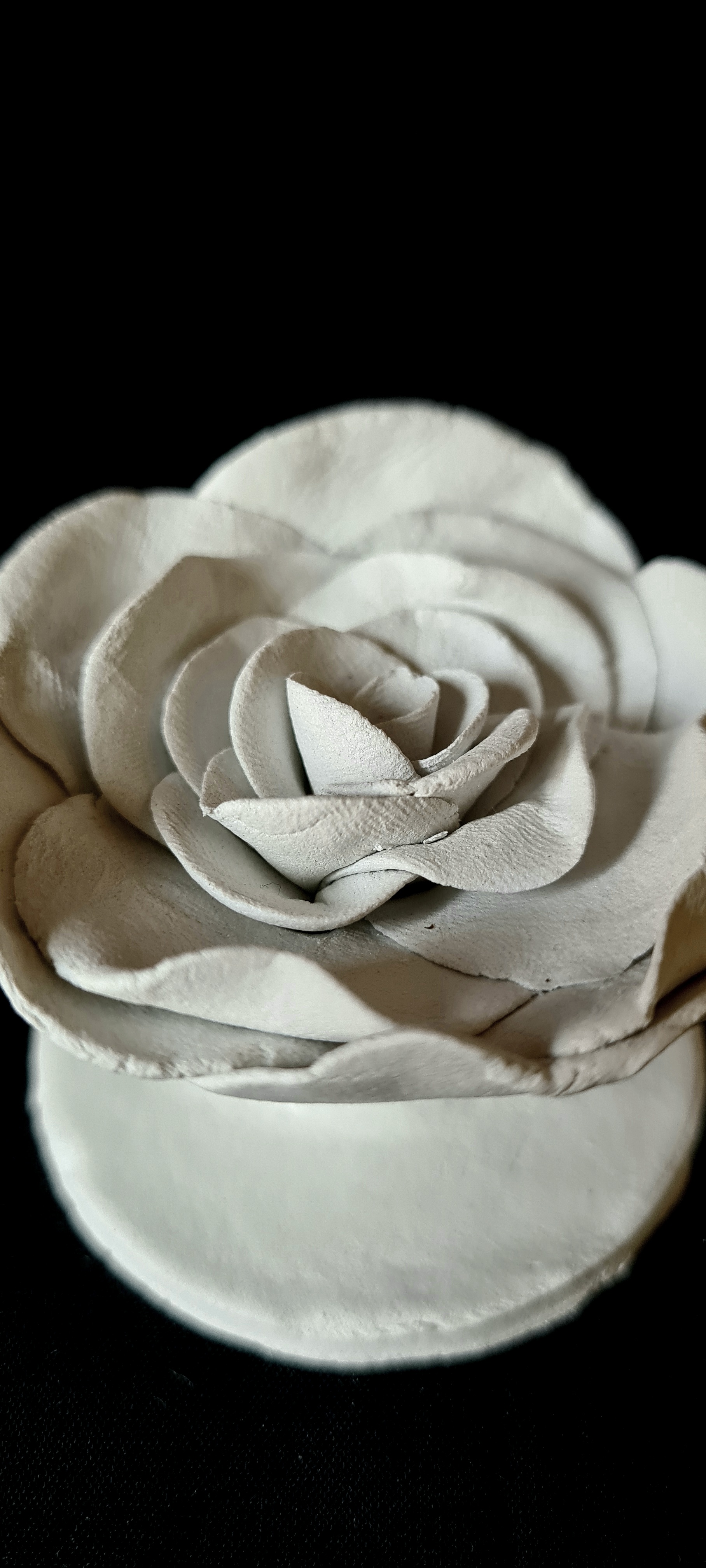 The artist has always been inspired by classical white marble sculptures from the Greek and Romans. This monchromatic collection of sculptured white flowers from clay gets its inspiration from that fascination. The artist does not have a lot of experience with sculpture so this collection was a fun and experimental expression of her love for nature and themes relating to growth, life and death.