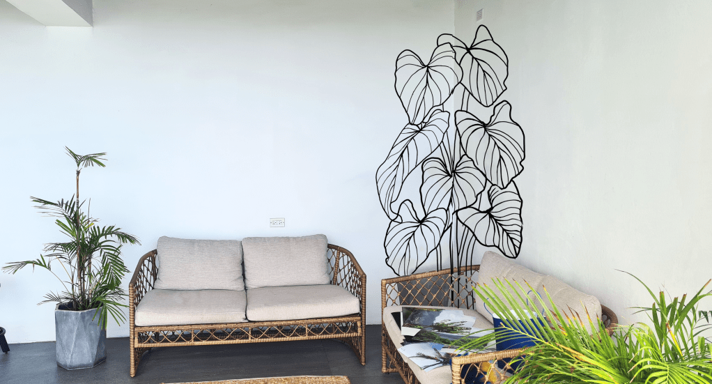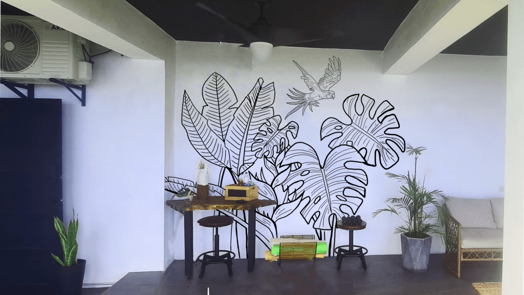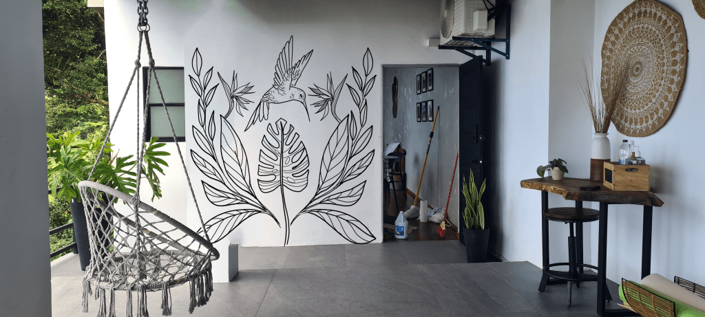 Designed for a beautiful cabin in Paramin, these mural designs are inspired by the tropical landscape that surrounds the Airbnb. The beautiful macaws and hummingbirds fly by every day over the lush green and diverse tropical rainforest. These designs seek to capture the essence of what visitors come to experience, but also add beautiful décor to the space. It was created to reflect the natural environment, but also was integrated into the modern and cottage like design of the cabin.