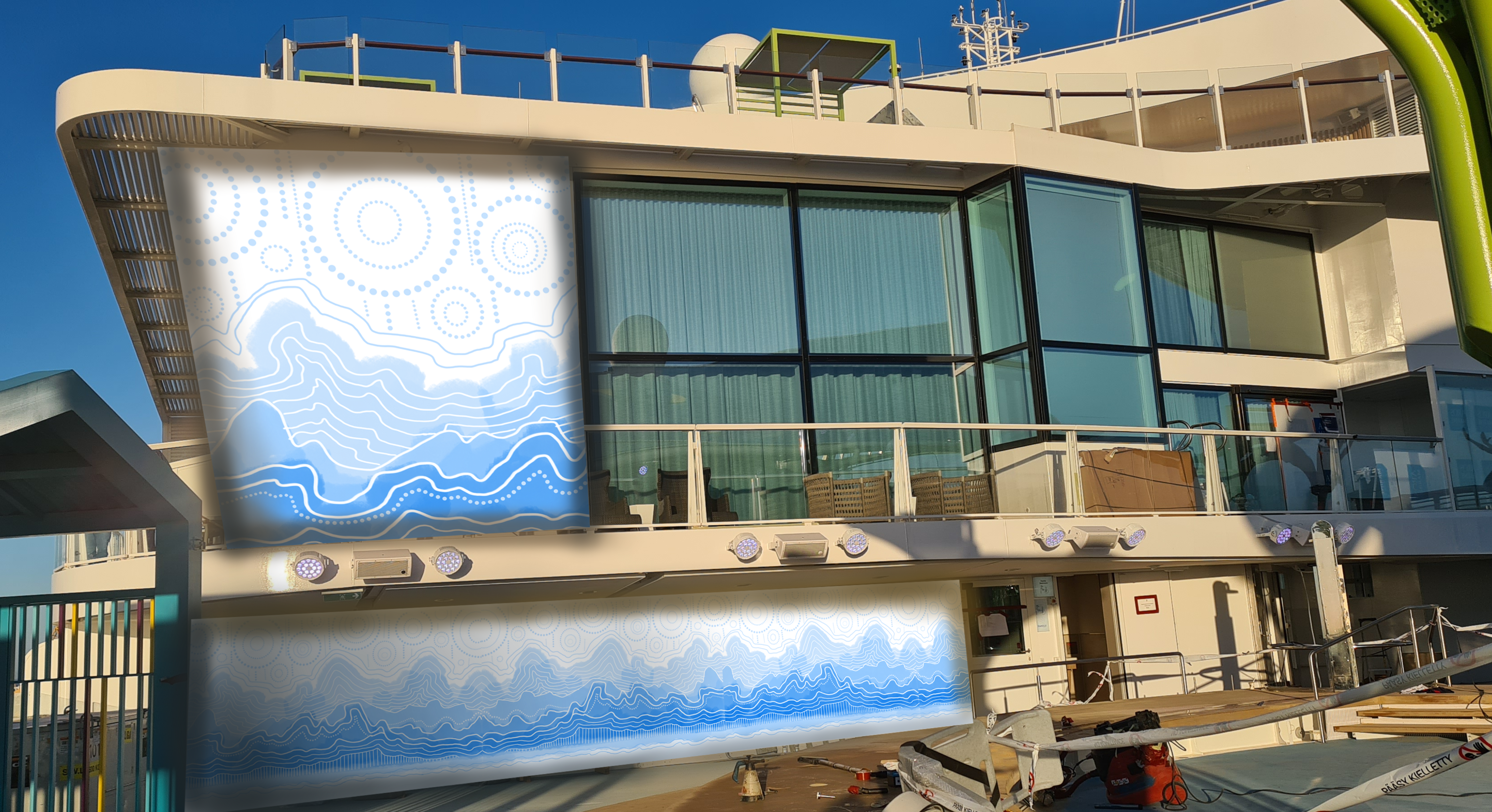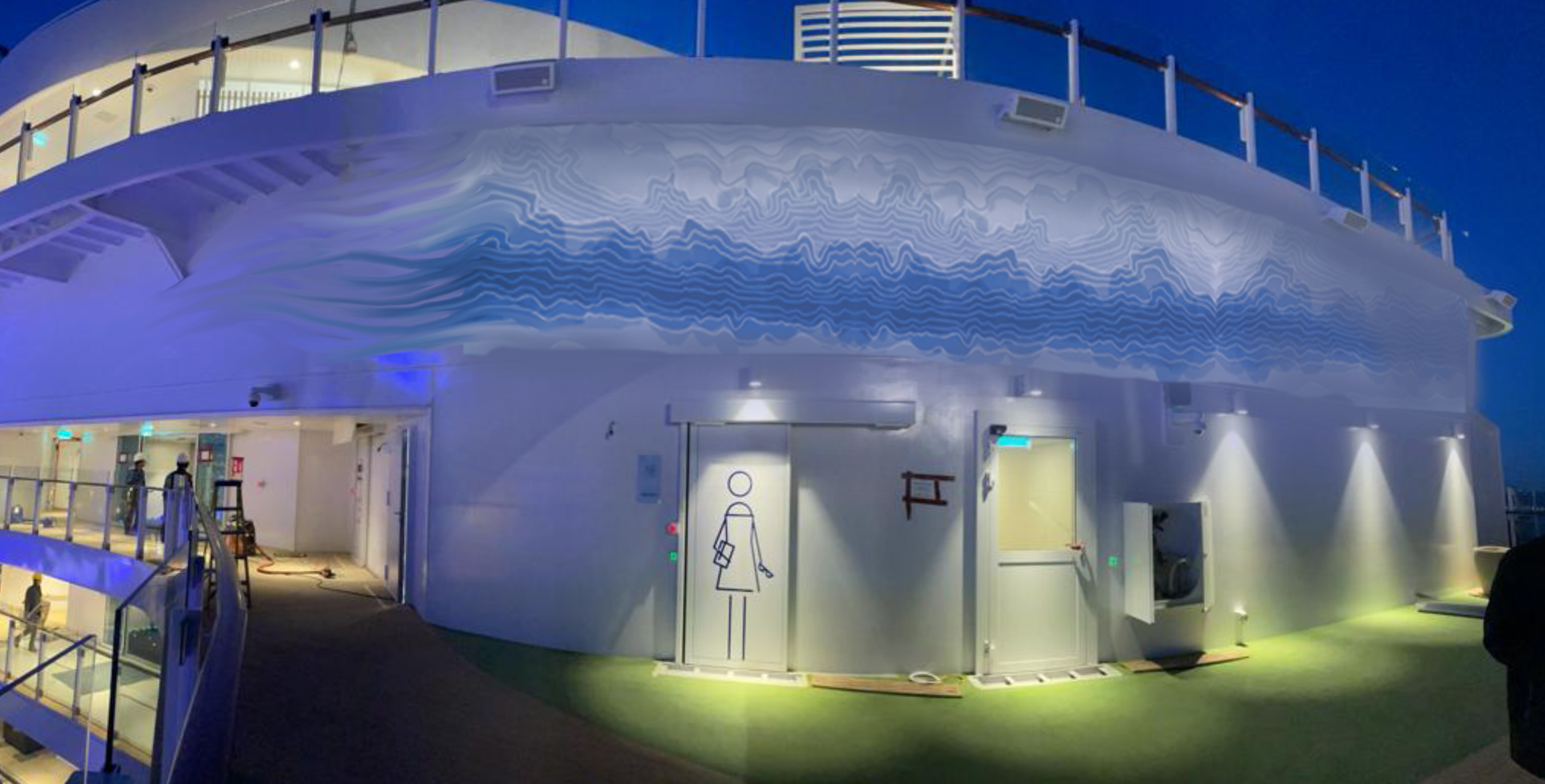 Royal Bliss is a series of designs done for Cloud 17 on Deck 17, and Swim and Tonic Deck on Deck 16, on Royal Caribbean’s Icon of the Seas, the world’s largest cruise ship to date. The Royal Bliss is inspired by a collection of beautiful blue monochrome ink paintings created by the artist, that is installed on Deck 11 on the Icon of the Seas.